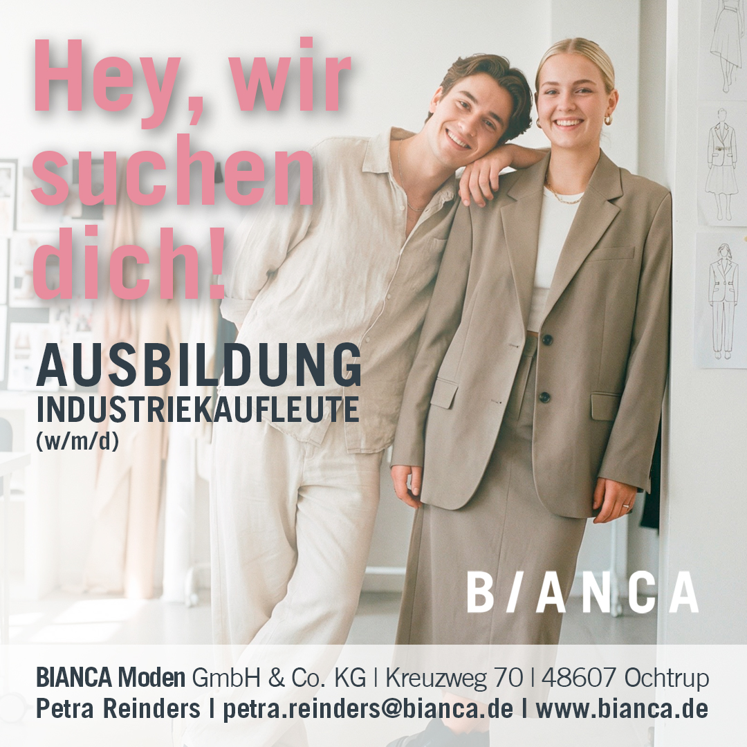Entdecken Sie die vielfältigen Möglichkeiten, die BIANCA Ihnen bietet, und gestalten Sie mit uns die Zukunft der Modebranche. Hier finden Sie offene Stellen und erfahren mehr über Ihre Bewerbungsmöglichkeiten. Wir freuen uns darauf, von Ihnen zu hören um gemeinsam neue Maßstäbe in der Mode zu setzen.