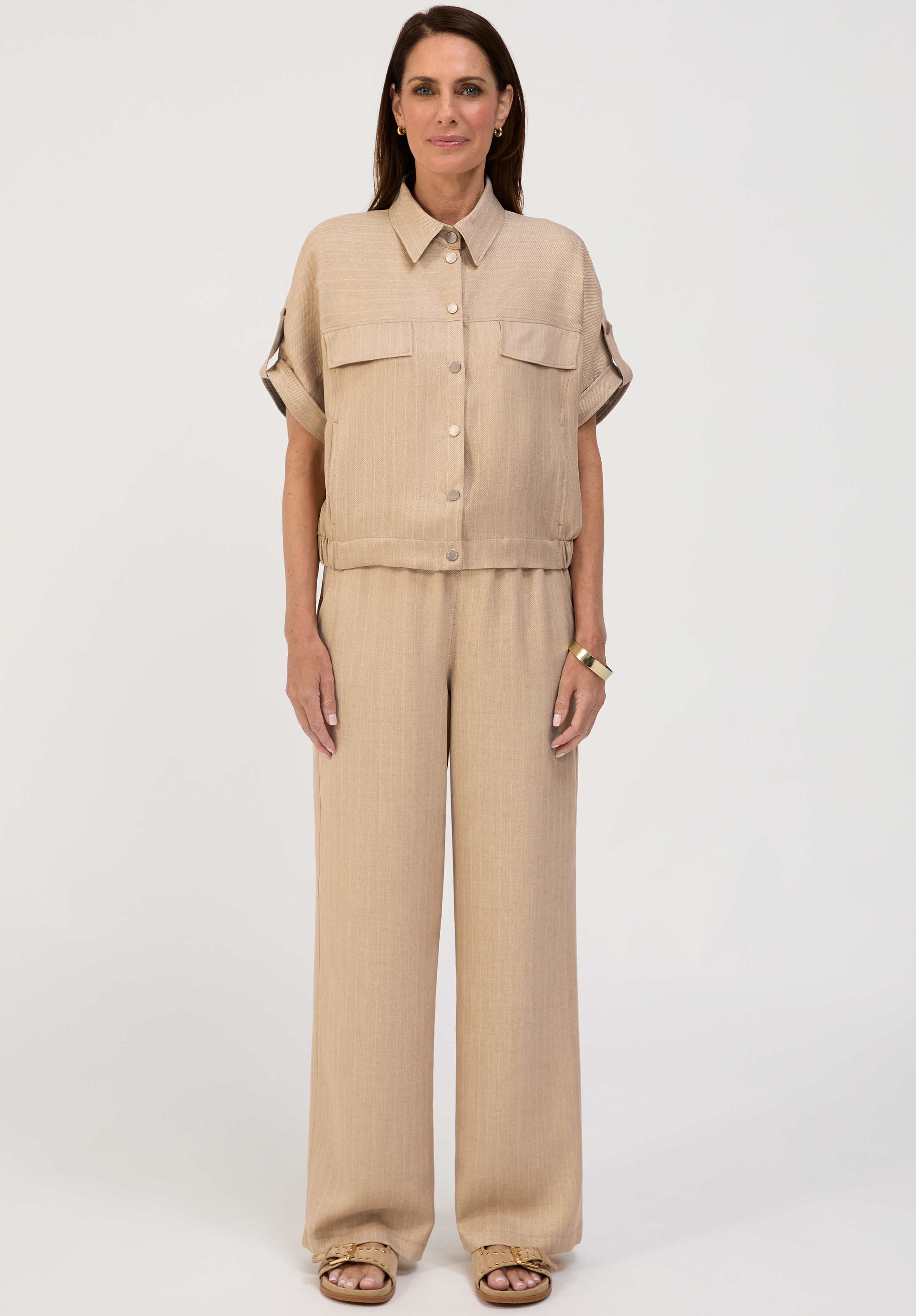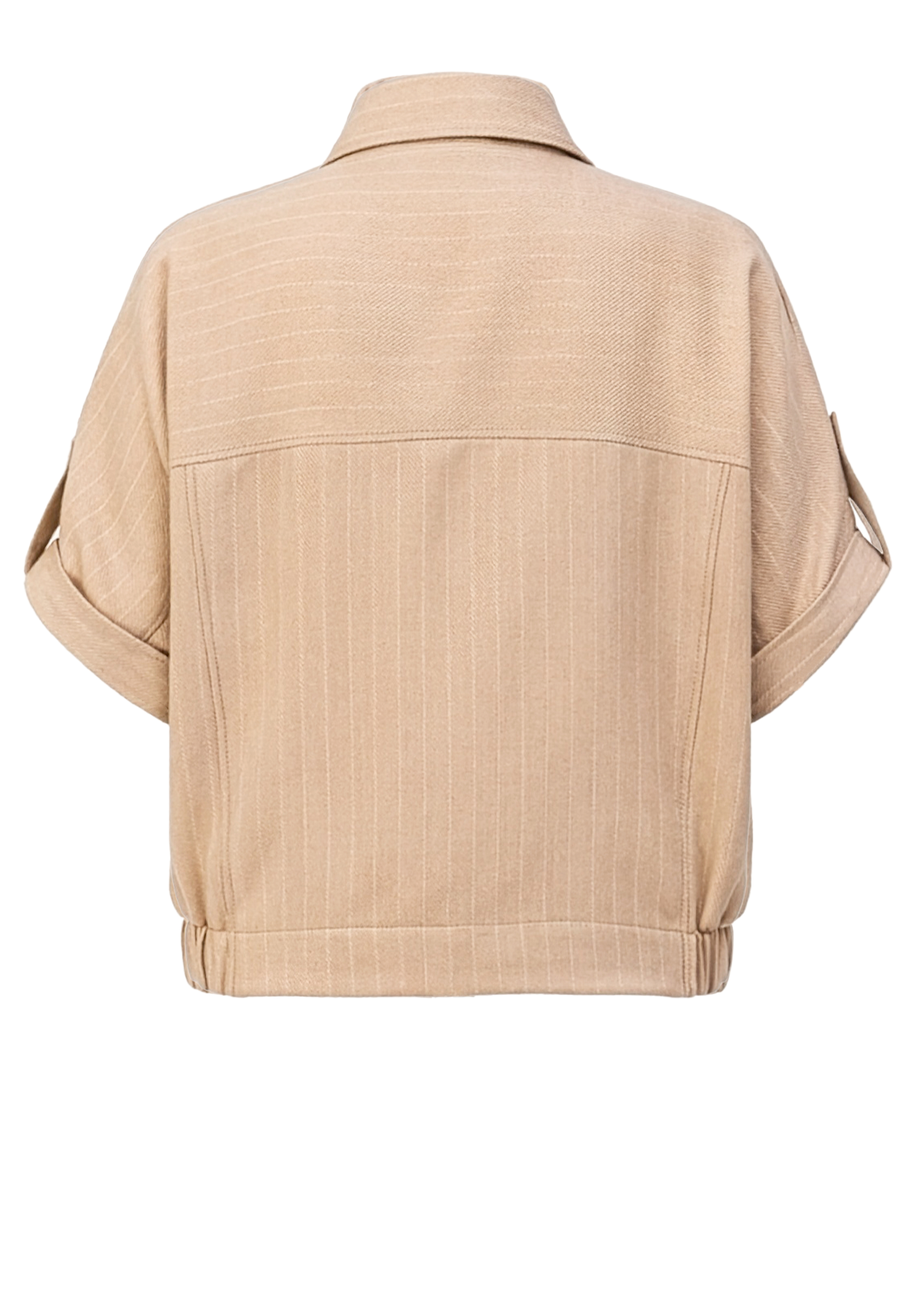 Modischer Chic trifft auf aufwendige Details - unsere neue Blusenjacke Emi ist ein echtes Highlight für stilvolle Looks. Der dezente Streifen verleiht der Jacke eine elegante Note, während der klassische Hemdkragen und der matte Druckverschluss in Gold das Design modern abrunden. Überschnittene Schultern und kurze Ärmel sorgen für eine lässige, zeitgemäße Ausstrahlung. Die lockere Passform mit seitlichen Gummibundeinsätzen bietet angenehmen Tragekomfort und eine schöne Silhouette. Emi lässt sich vielseitig kombinieren und ist der perfekte Begleiter für modische Alltags- und Business-Outfits.