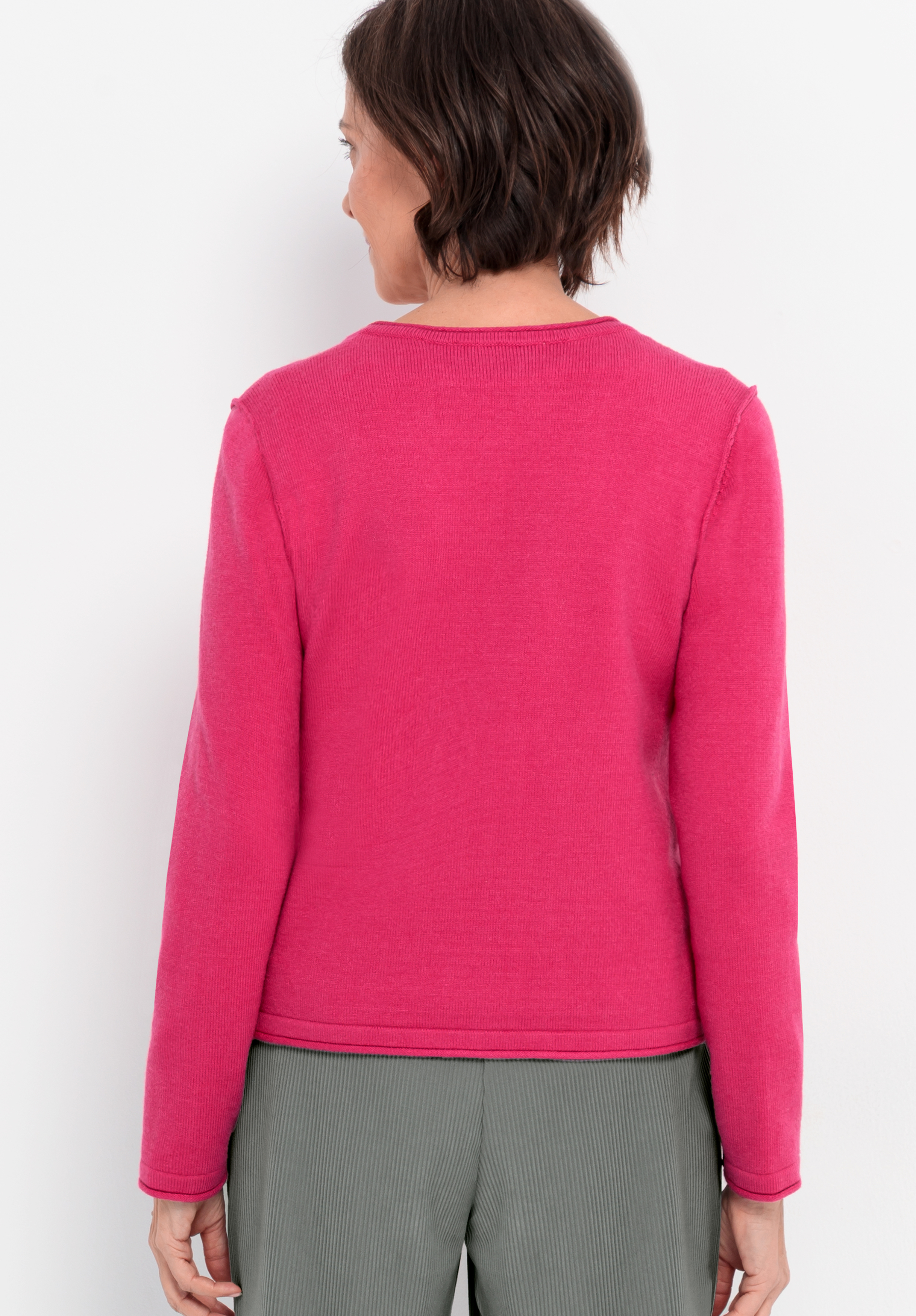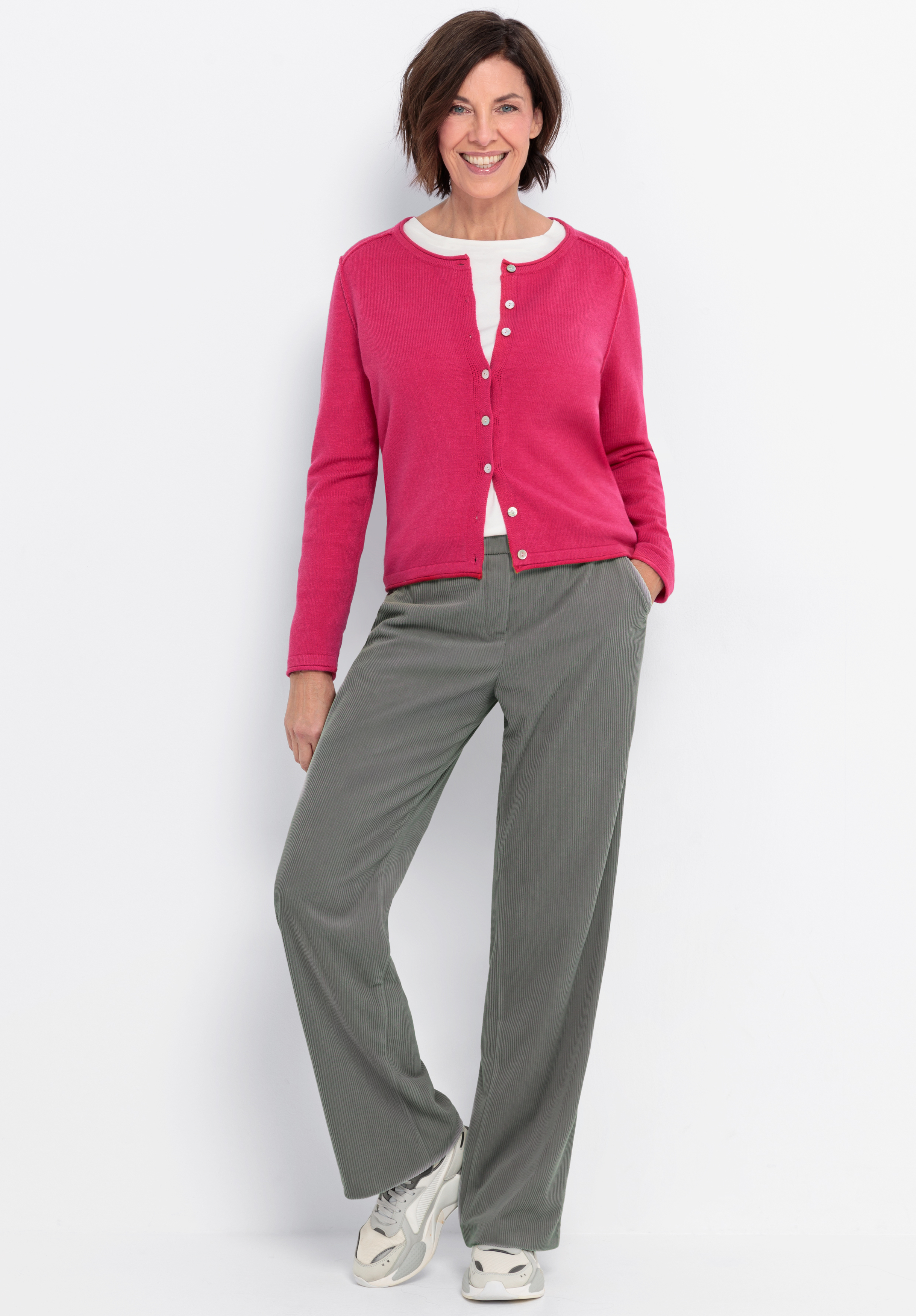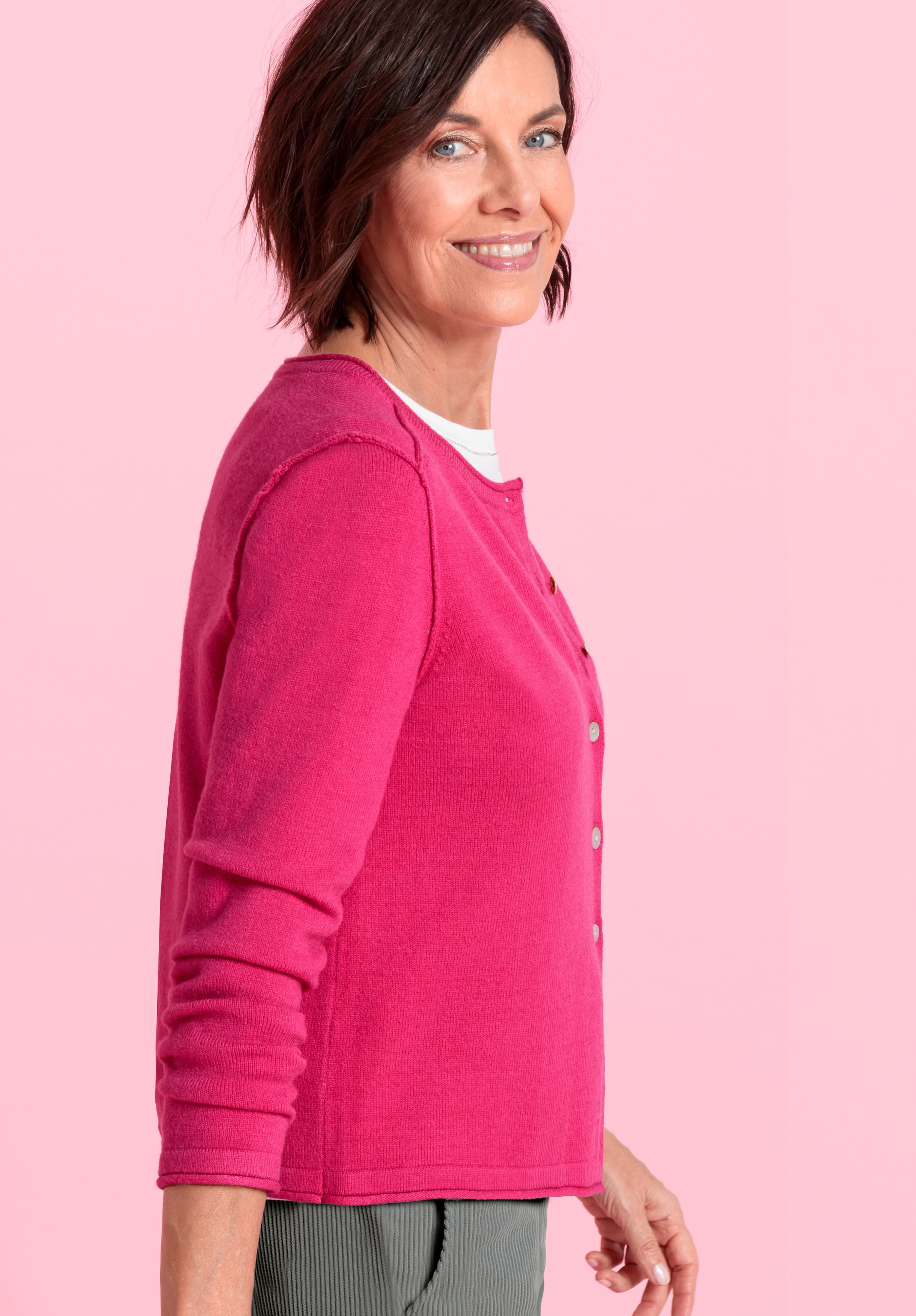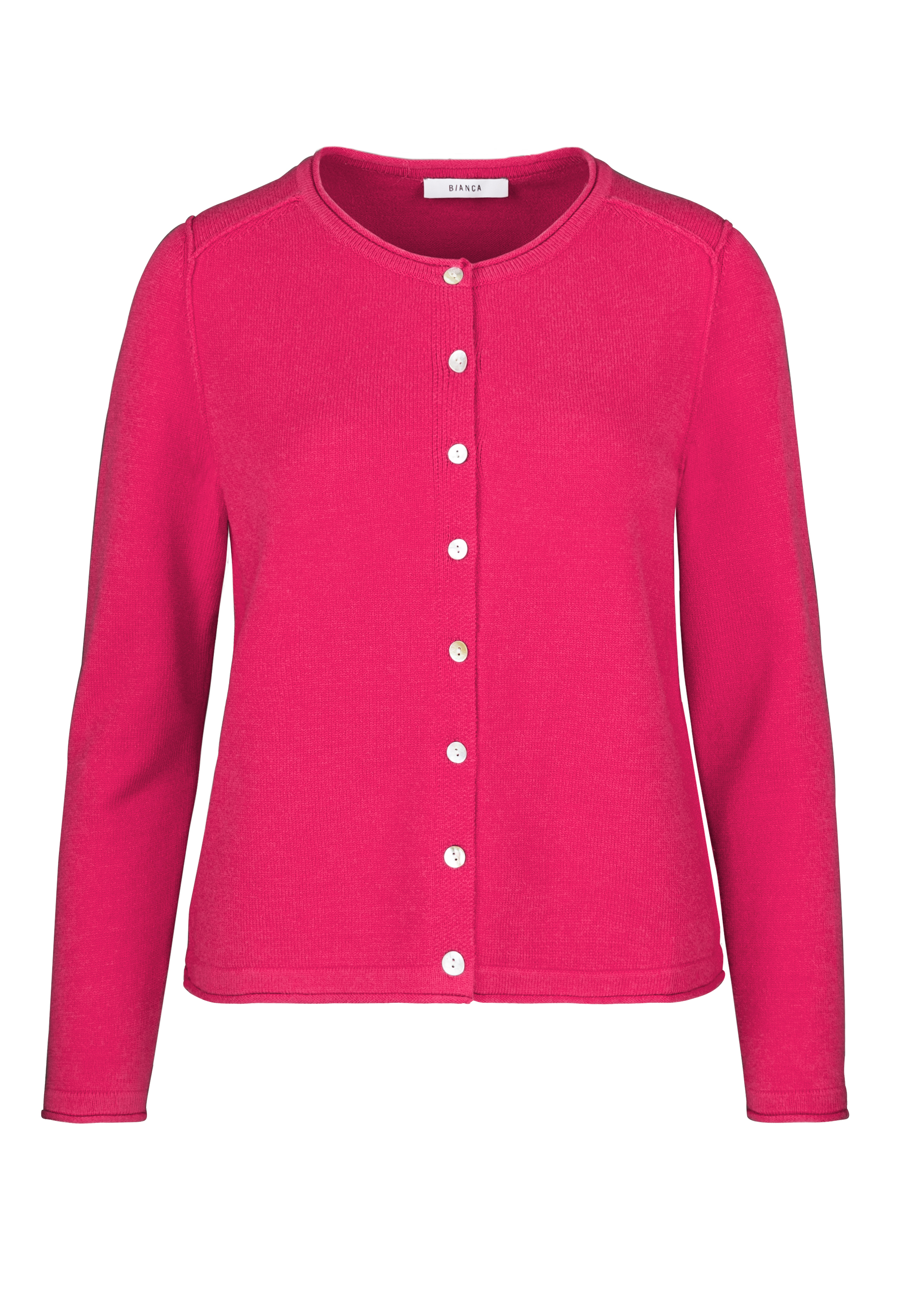Unser neuer kuscheliger Cardigan Ranis in trendigem Pink aus weicher Strickware, ein vielseitiger Begleiter für viele Outfits. Der Rundhalsausschnitt mit Rollkante und die dezenten Außennähte setzen modische Akzente. Mit Langarm, gerader, lockerer Passform und einer Knopfleiste mit edlen Perlmutt-Knöpfen trägt sich Ranis angenehm und lässt sich sowohl lässig zu Jeans als auch schick zur Businesshose kombinieren.