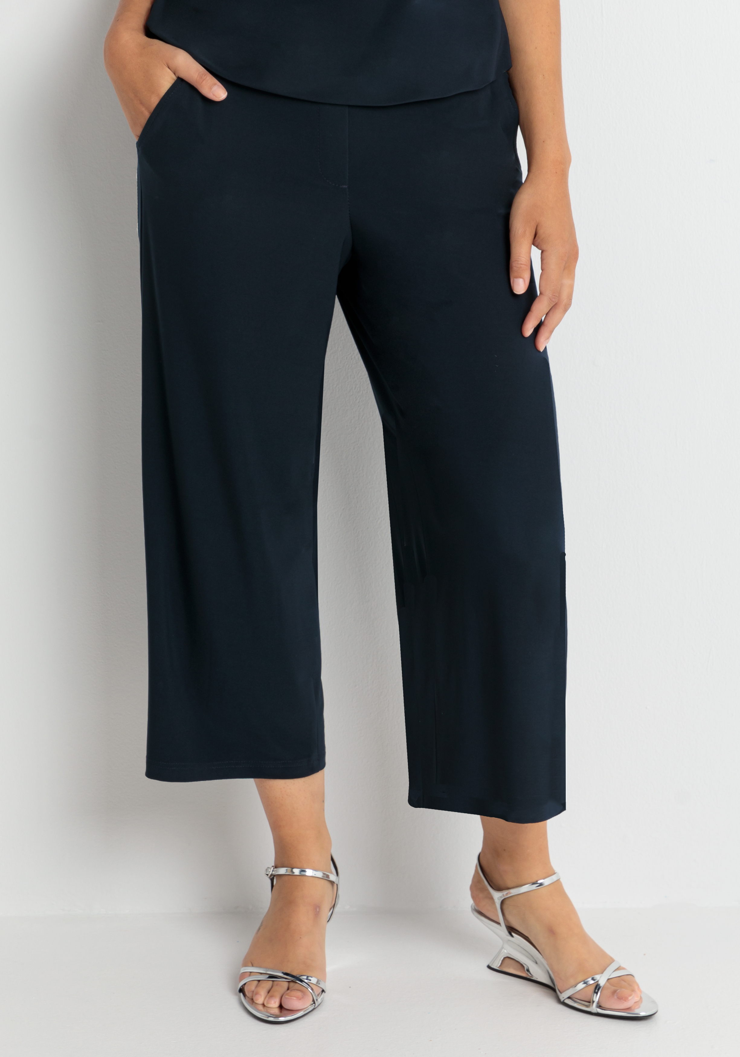 Eine Frau steht vor einer weißen Wand und trägt ein marineblaues, kurzärmeliges Oberteil mit drapiertem Ausschnitt und eine dazu passende Hose mit weitem Bein. Sie trägt silberne Riemchensandalen und hat die linke Hand in ihrer Tasche.