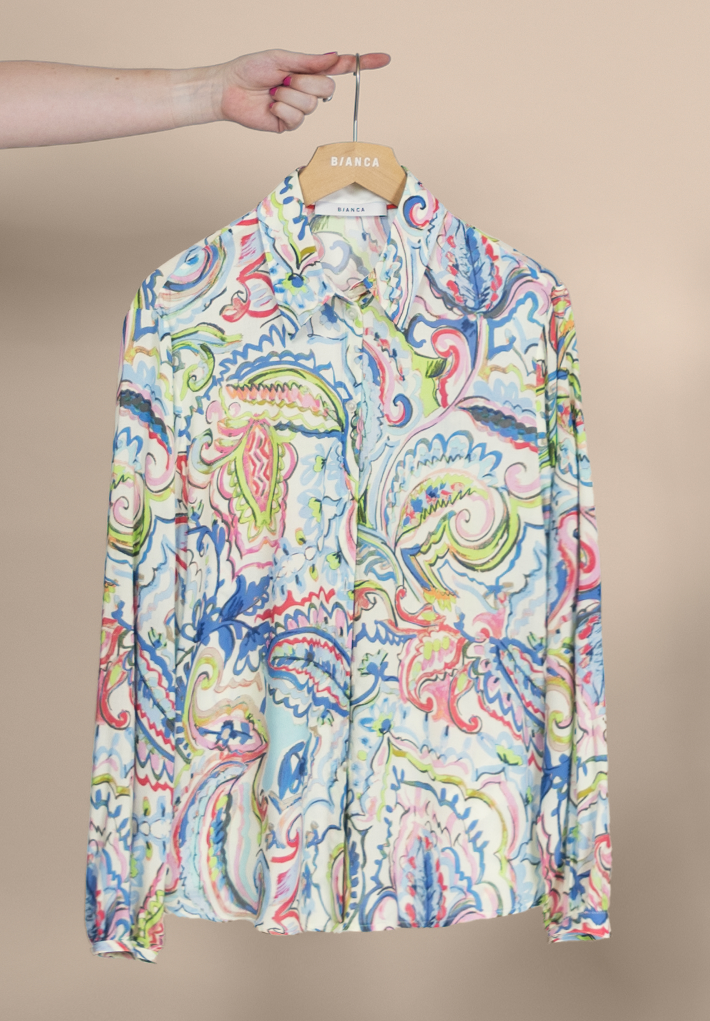 Elegant und lässig zugleich! Unsere moderne Druckbluse besticht durch ihr stilvolles Paisley-Design in aktuellen Trendfarben. Mit klassischem Hemdblusenkragen, durchgehender Knopfleiste und abgerundetem Saum kombiniert sie feminine Details mit einem entspannten Look. Die gerade, lockere Passform und der Langarm sorgen für angenehmen Tragekomfort, während die hochwertige 100% Viskose die Bluse besonders weich und leicht macht. Ein vielseitiger Begleiter, ideal für Business, Freizeit oder besondere Anlässe.
