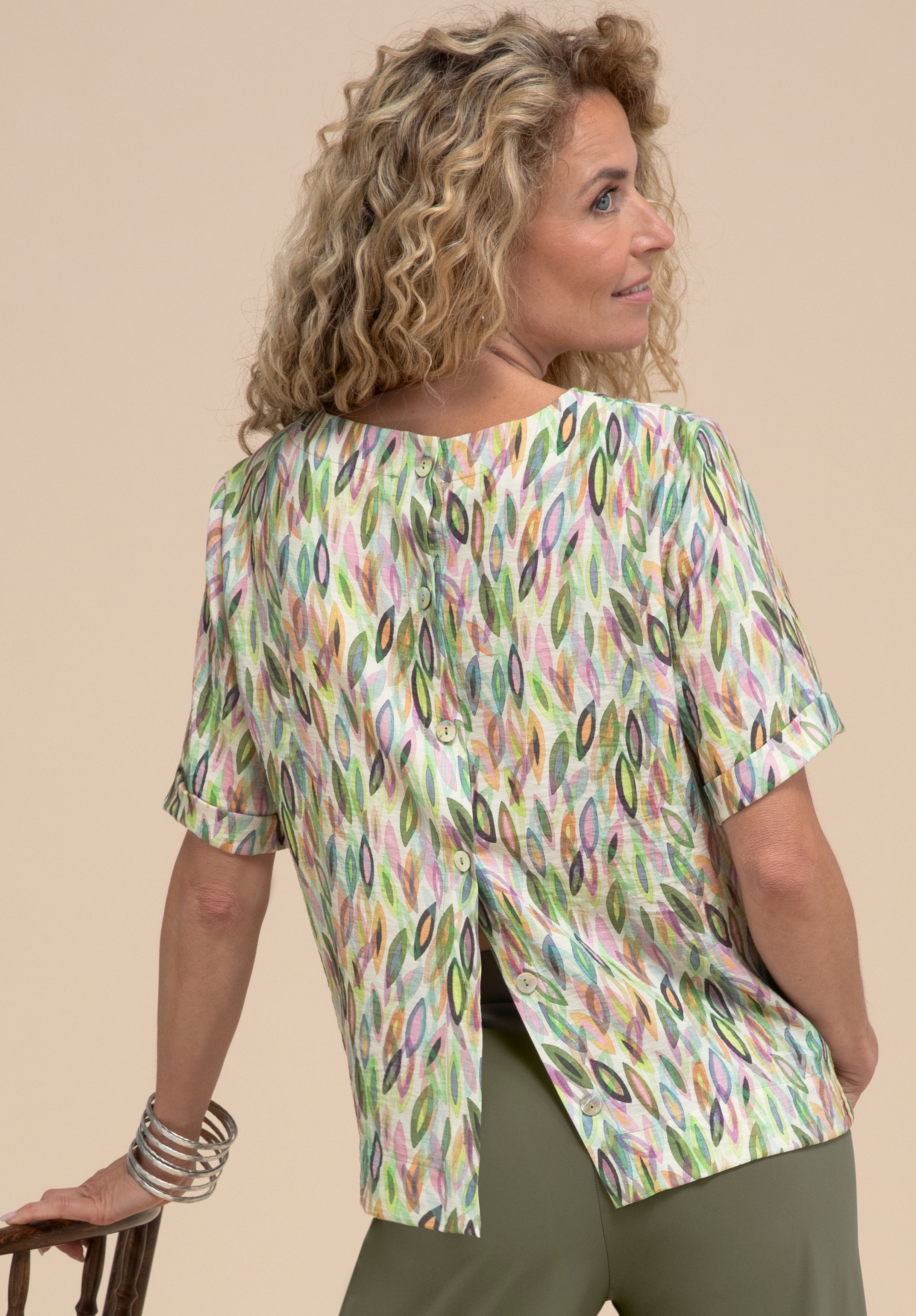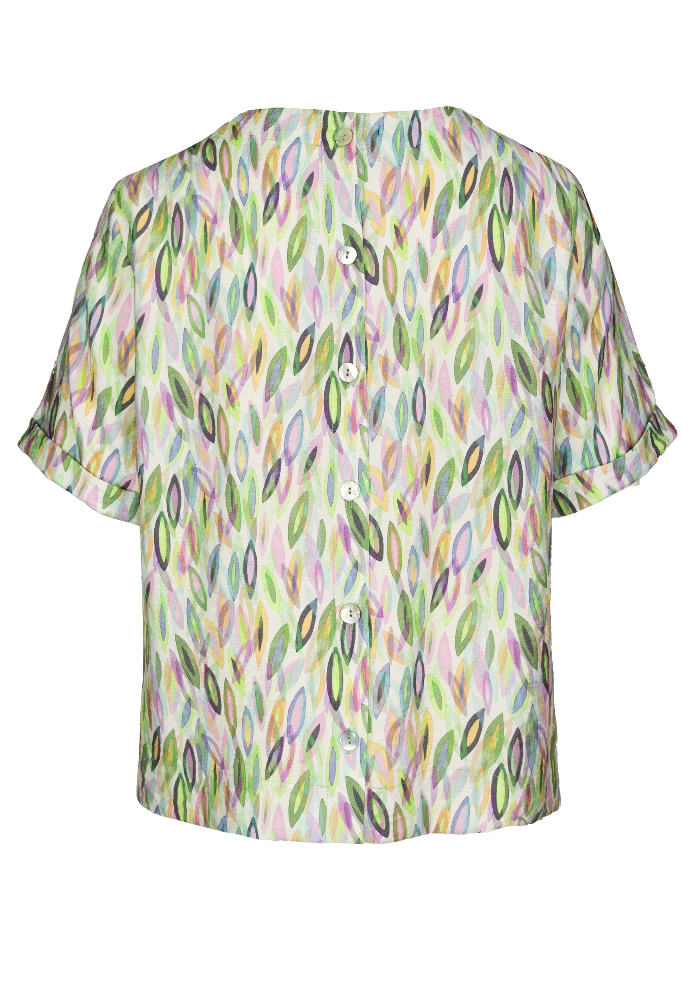 Unsere moderne Schlupfbluse Darni überzeugt mit einem trendigen grafischen Allovermuster und einer stilvollen, zeitgemäßen Ausstrahlung. Der Rundhalsausschnitt, kurze Ärmel und eine moderne Knopfleiste im Rückenteil unterstreichen das cleane Design.