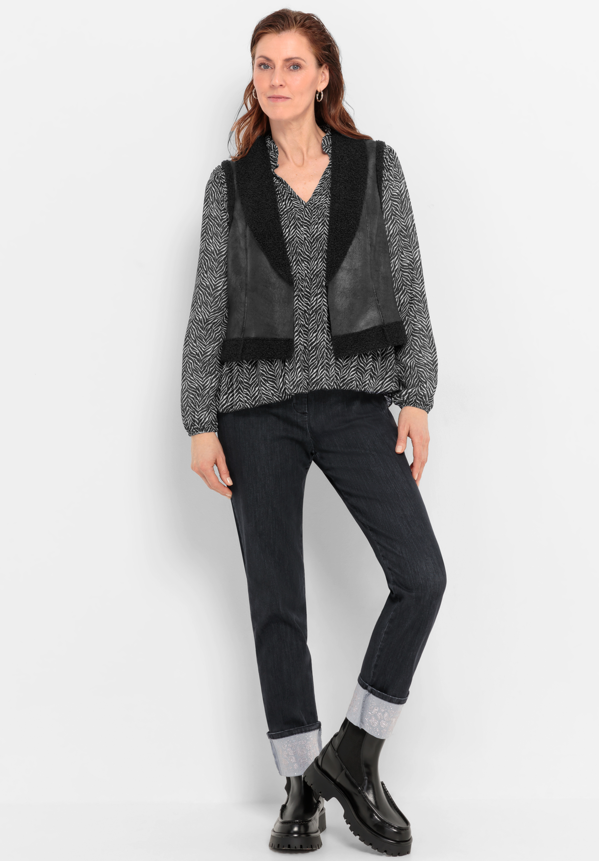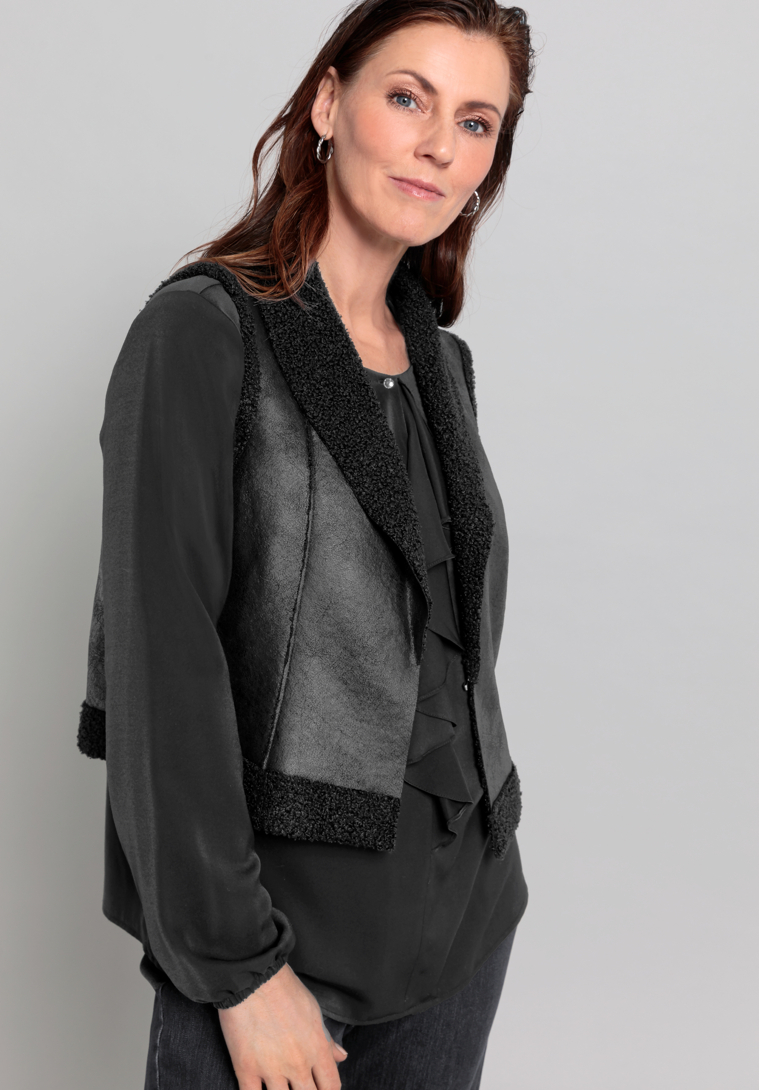 Lässig und stylisch - unsere coole Fellimitat-Weste Sophie überzeugt mit weicher Shearling-Optik und Reverskragen. Formgebende Teilungsnähte und der praktische Haken- und Ösenverschluss setzen modische Akzente. Die gerade und lockere Passform sorgt für angenehmen Tragekomfort. Pflegeleicht und vielseitig kombinierbar, ein Must-Have für coole Layer-Looks.