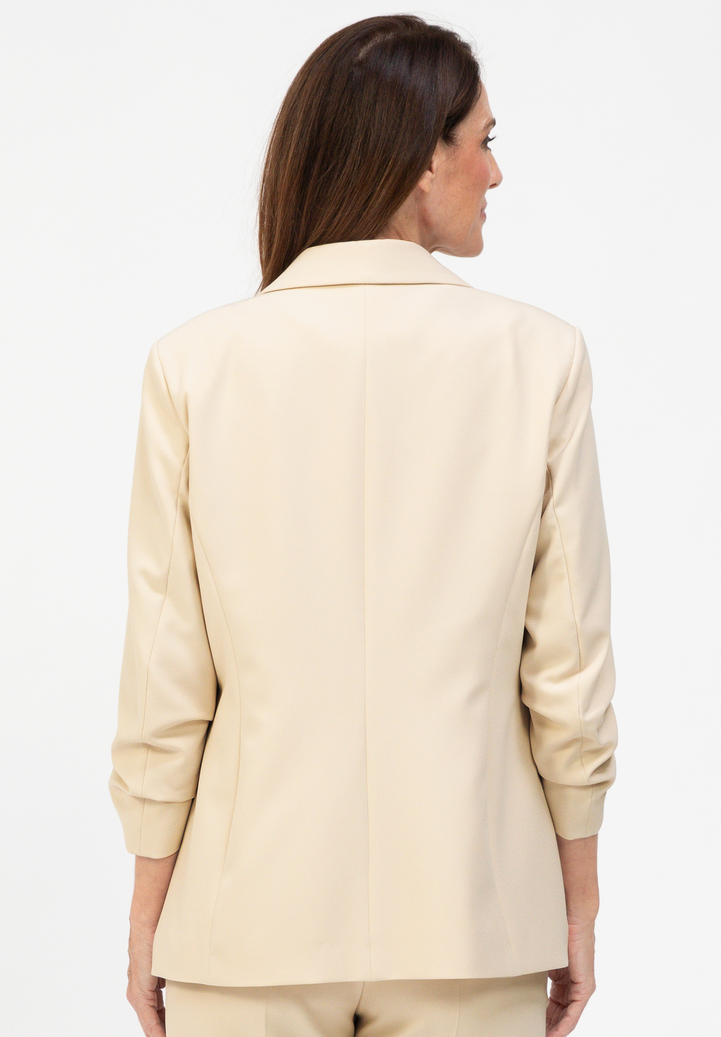 Unser neuer, trendiger Blazer Edith ist ein echtes Must-have für jede Garderobe. Der klassische Reverskragen, stilvolle Pattentaschen, ein feiner Haken- und Ösenverschluss sowie der modische 3/4-Arm mit leichter Raffung verleihen dem Blazer eine elegante, moderne Note. Dank des hochwertigen Materialmixes mit Elasthan und der geraden Passform mit formgebenden Nähten bietet Edith hohen Tragekomfort und eine schöne Silhouette. Ob elegant mit Bluse oder lässig-schick mit Shirt kombiniert - dieser Blazer ist vielseitig einsetzbar.