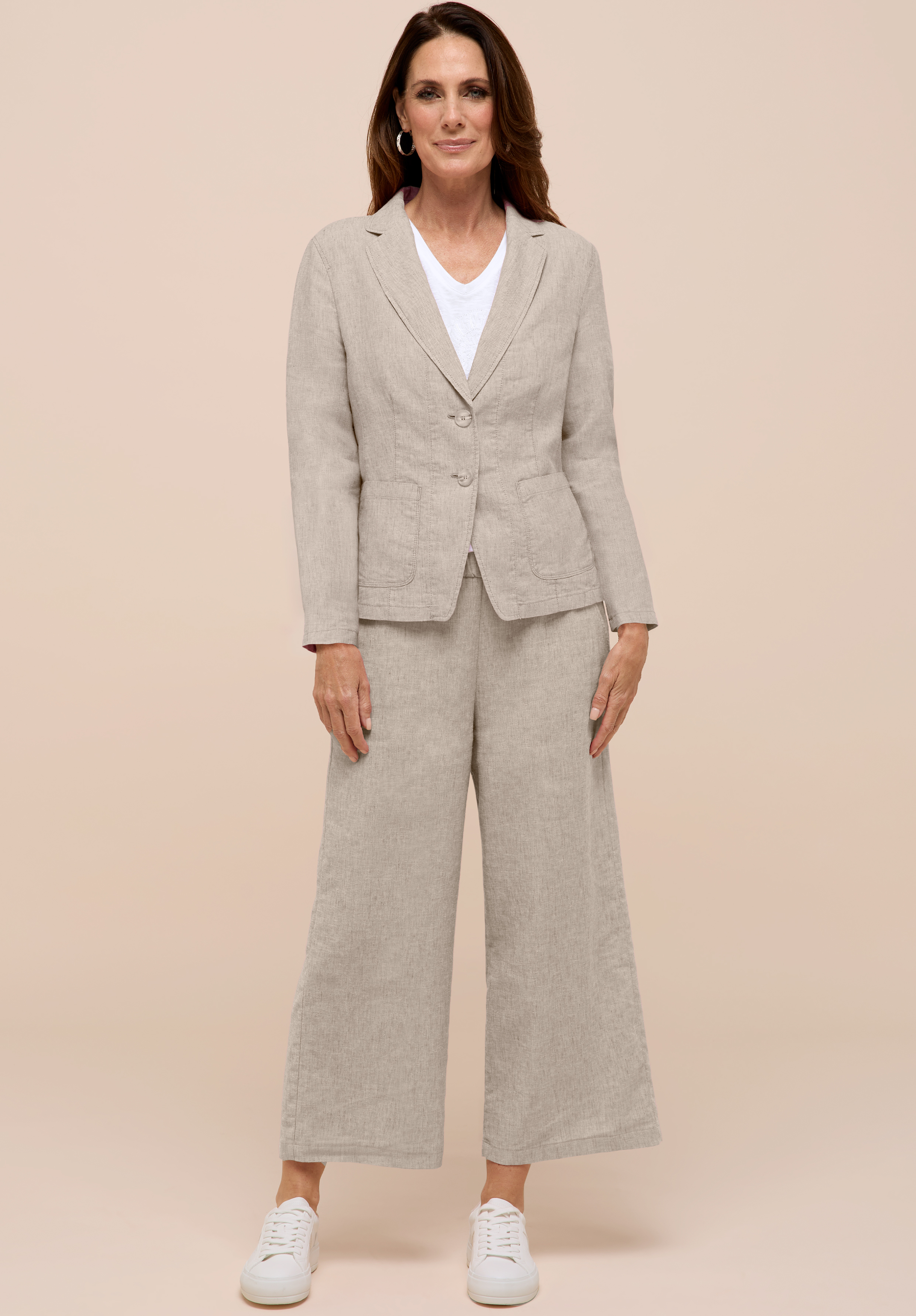 Unser lässiger Jackenblazer Sunny überzeugt mit moderner Leinen-Optik und einer entspannten, stilvollen Ausstrahlung. Der klassische Reverskragen, ein 2-Knopf-Verschluss und aufgesetzte Taschen verleihen dem Blazer eine zeitgemäße Note.Die lockere Passform sorgt für eine moderne Silhouette und angenehmen Tragekomfort. Gefertigt aus einem ausgesuchten Materialmix mit Leinenanteil und ungefüttert verarbeitet, trägt sich der Blazer besonders leicht und luftig. Sunny ist damit der ideale Begleiter für stilvolle Casual- und Sommer-Looks.