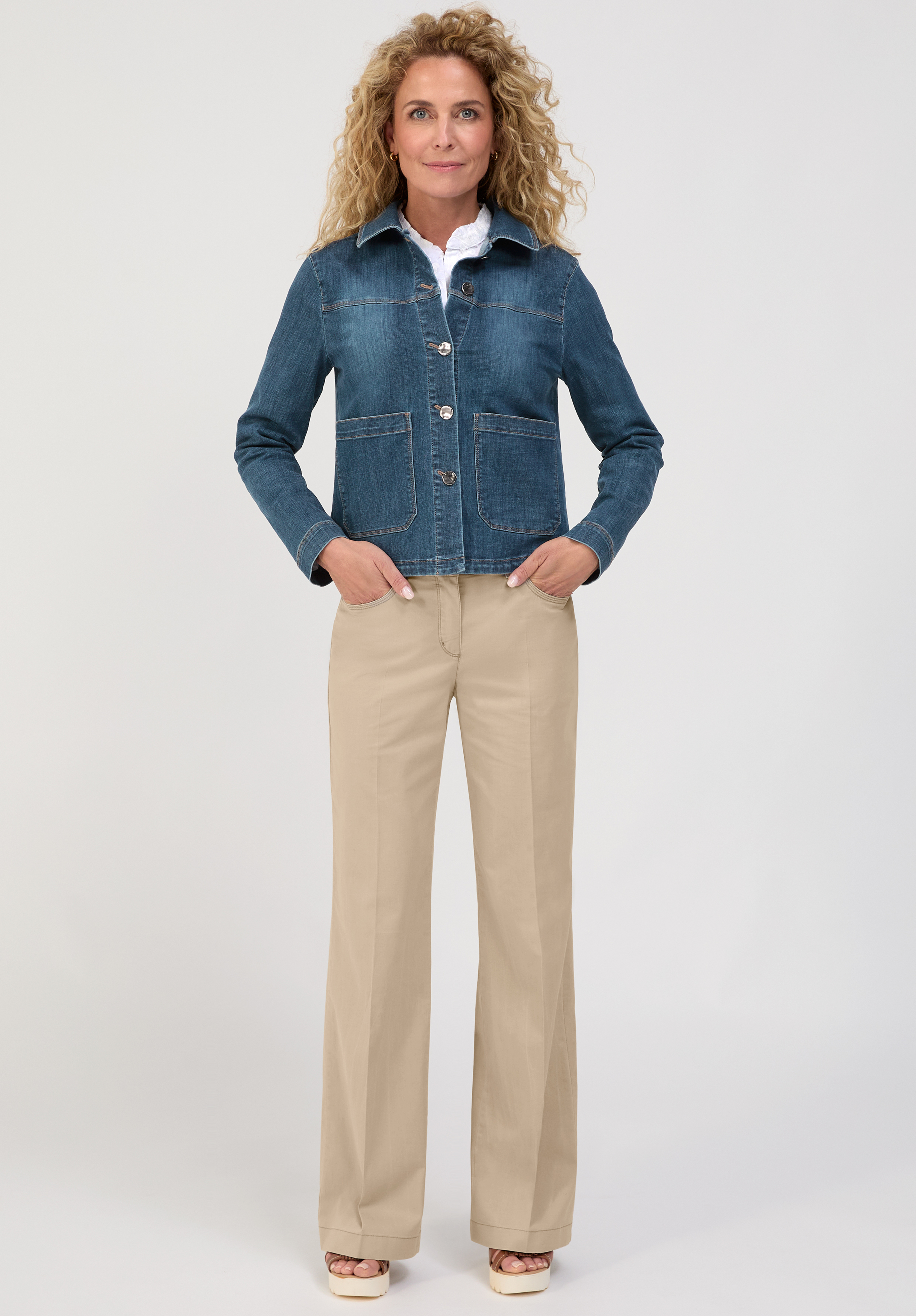 Unsere stylische Jeansjacke Katherin präsentiert sich in einer modernen, angesagten Silhouette und wird schnell zum vielseitigen Lieblingsstück. Der Hemdkragen, die durchgehende Knopfleiste und die aufgesetzten Taschen verleihen ihr einen authentischen Denim-Look. Gefertigt aus hochwertigem Jeansmaterial mit Elasthan bietet sie angenehme Bewegungsfreiheit. Die gerade, lockere Passform mit Langarm macht Katherin zu einem perfekten Begleiter für lässige und trendbewusste Outfits.