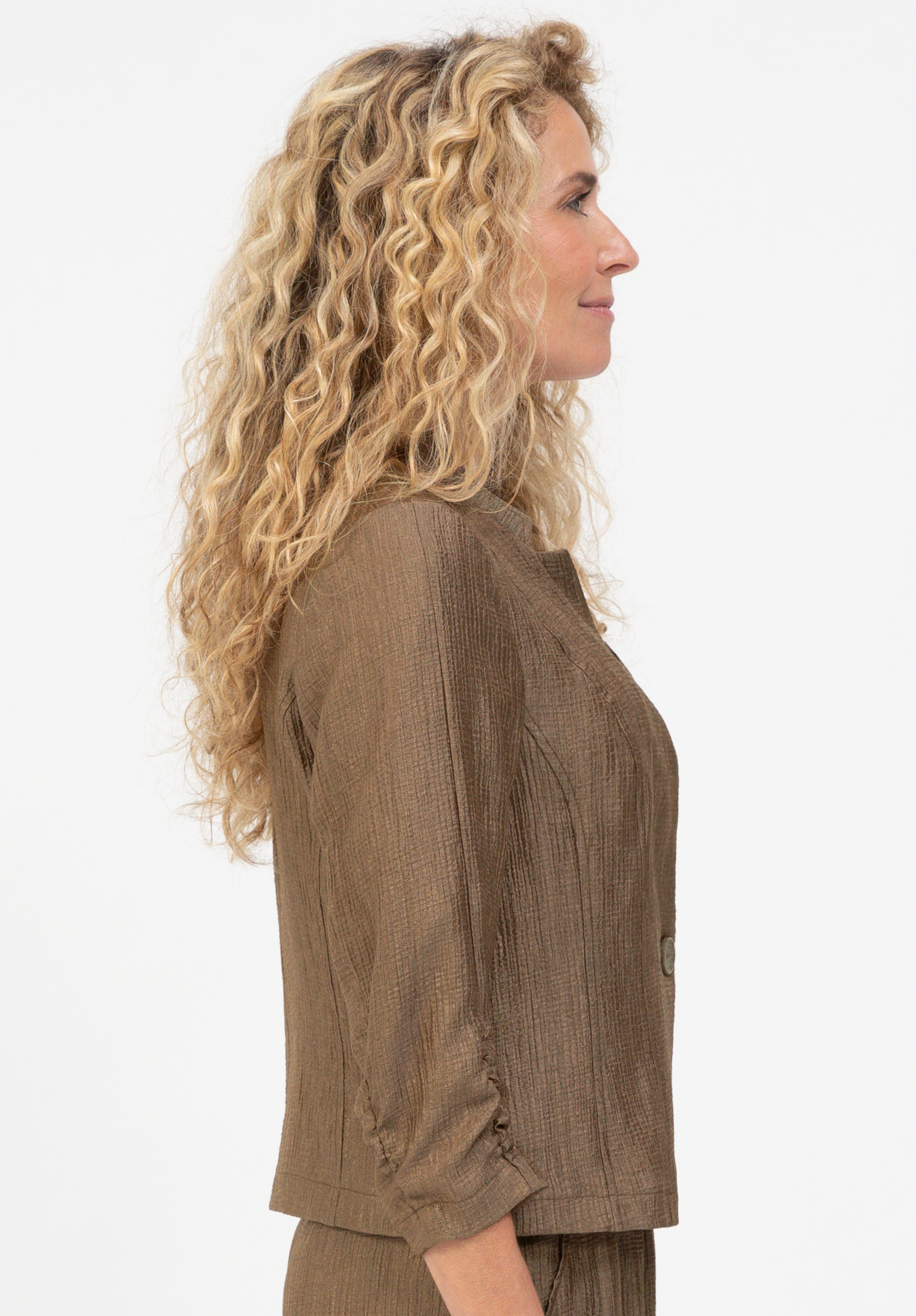 Unser Kurzblazer Liset verleiht jedem Outfit mit seinem femininen Look das gewisse Etwas. Die hochwertige Qualität und die leicht taillierte, ungefütterte Passform sorgen für ein angenehmes Tragegefühl. Dezente Details wie der 1-Knopf-Verschluss, der Stehkragen und die leicht gerafften 3/4-Ärmel setzen modische Akzente. Ob elegant über Kleid oder Bluse getragen, Liset ist ein stilvoller Begleiter für viele Anlässe.