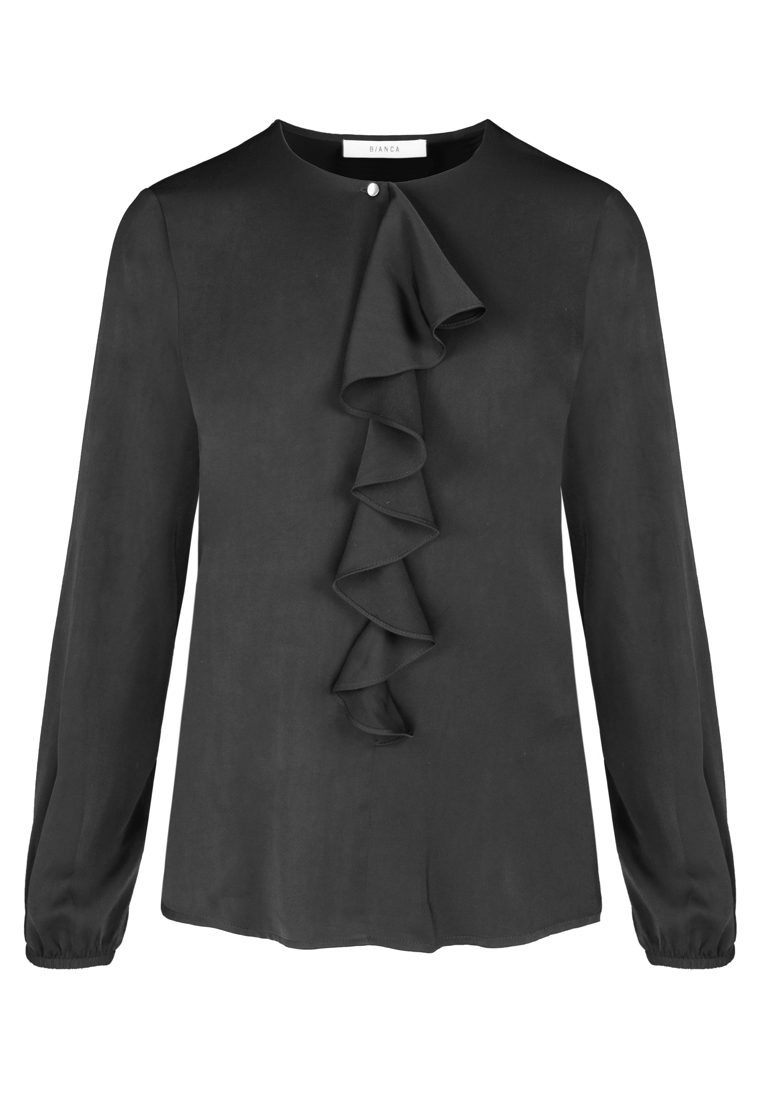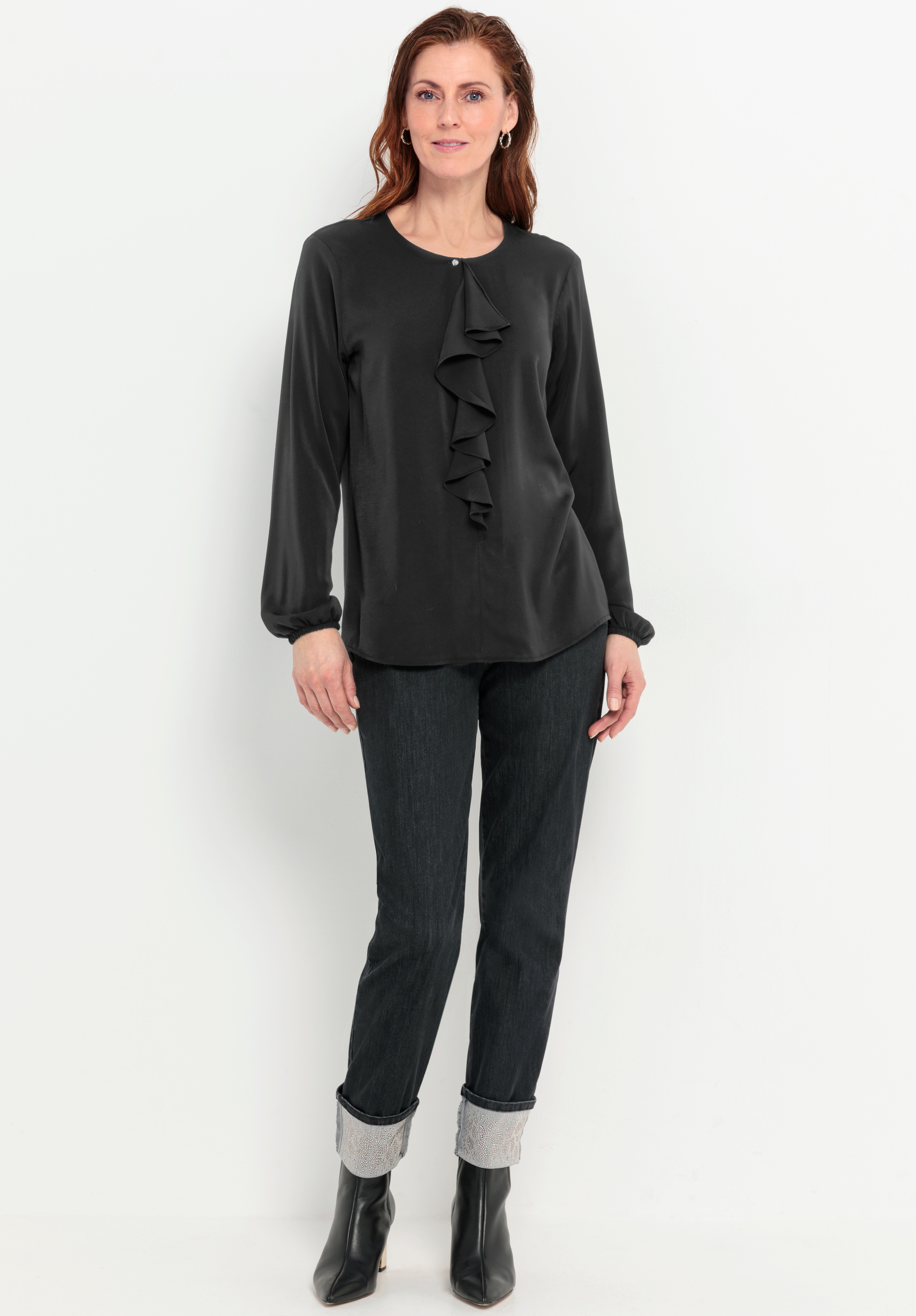 Unsere elegante Langarmbluse Vianna zeigt sich in klassischem Schwarz mit feinem Volantdetail. Der Rundhalsausschnitt mit kleinem Knopfverschluss, die langen Ärmel mit Gummibund und kleine Saumschlitze unterstreichen den modernen Look. Gefertigt aus einem hochwertigen, pflegeleichten Materialmix, trägt sich Vianna angenehm und ist vielseitig kombinierbar, ob zu Jeans in der Freizeit oder zu Business-Outfits für einen stilvollen Auftritt.