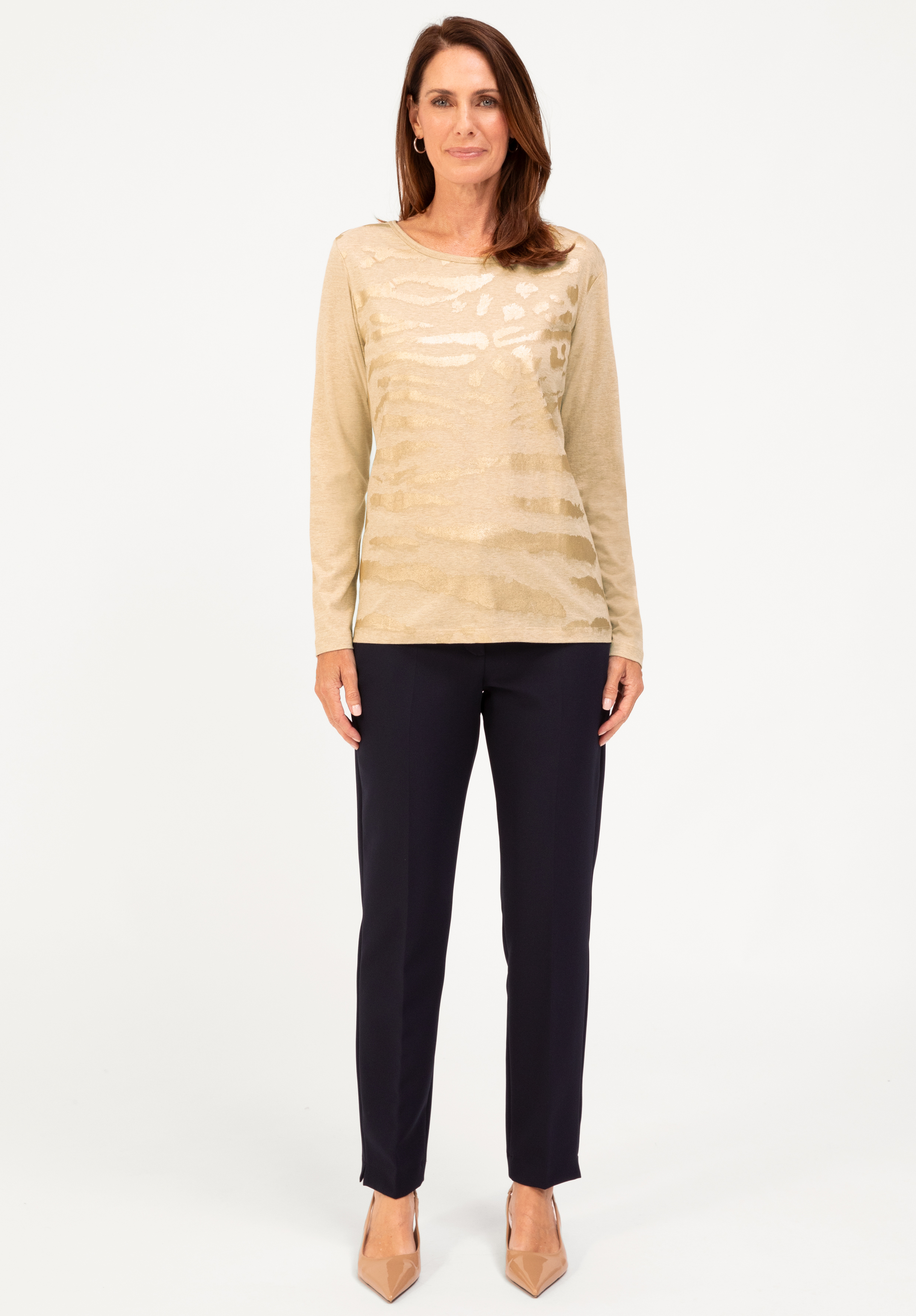 Zeitlos und modern! Unser Langarmshirt Dami begeistert in der Trendfarbe "toffee melange" mit einem dezenten, matt glänzenden Front-Print. Der Rundhalsausschnitt und die körpernahe Passform im geraden Schnitt unterstreichen das cleane Design. Gefertigt aus softer Baumwollqualität bietet es angenehmen Tragekomfort und ist vielseitig kombinierbar, ob casual zur Jeans oder stilvoll unter einem Blazer.