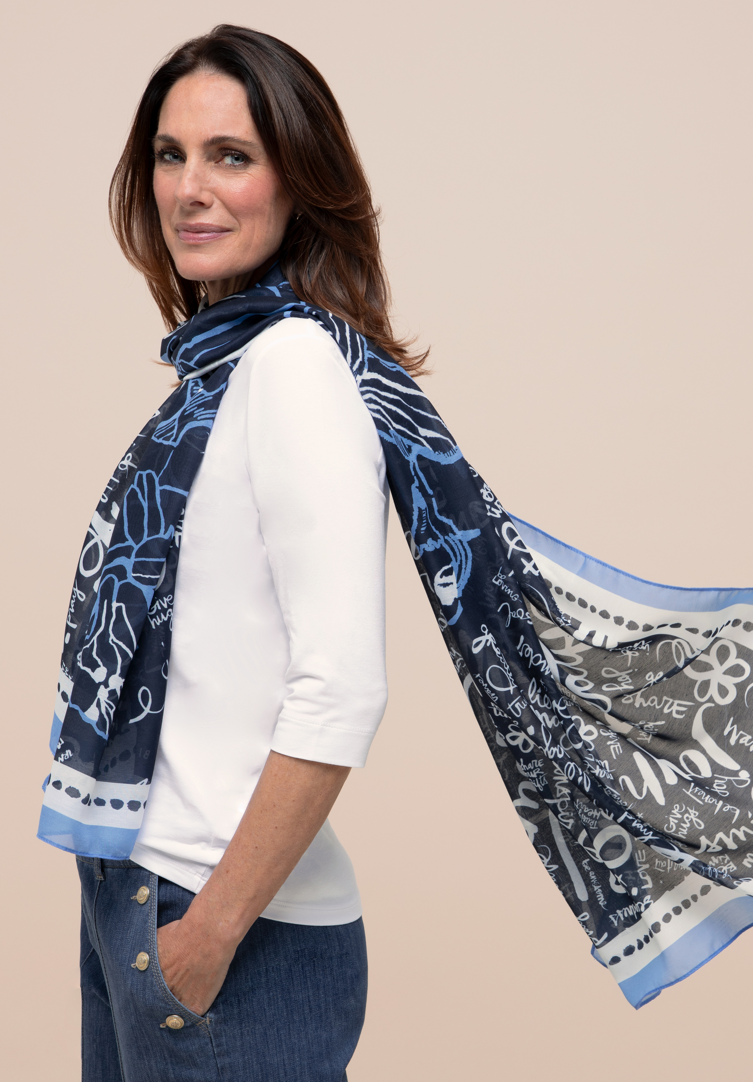 Unser Modetuch Kapa überzeugt mit einem coolem Mustermix mit Wording und weich fließender Qualität. Es fällt luftig und angenehm weich und lässt sich vielseitig kombinieren, ob zu Blazer und Bluse oder Jeansjacke und Shirt. Ein modernes Accessoire, das jedem Outfit stilvolle Akzente verleiht und sich für viele Anlässe eignet.