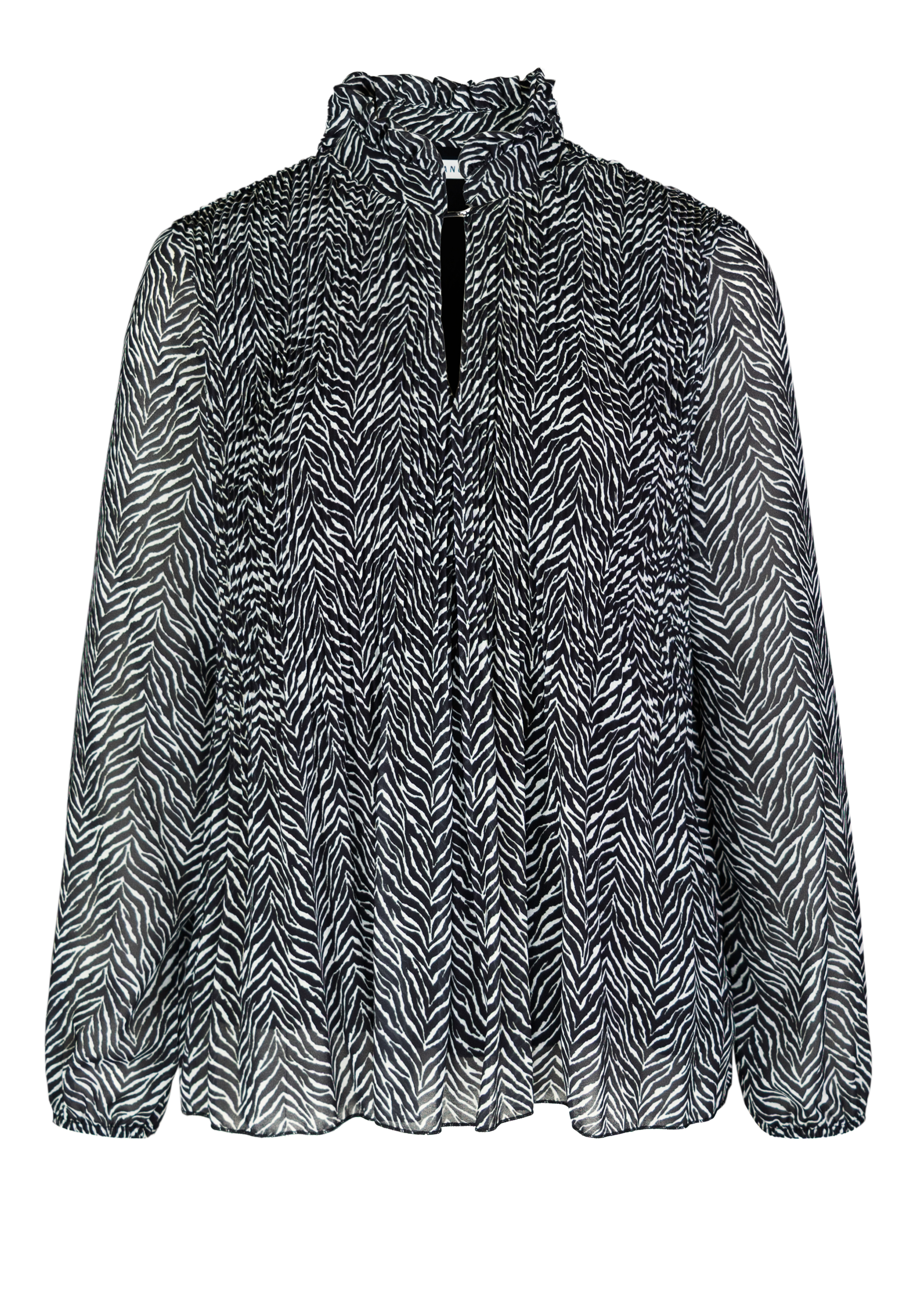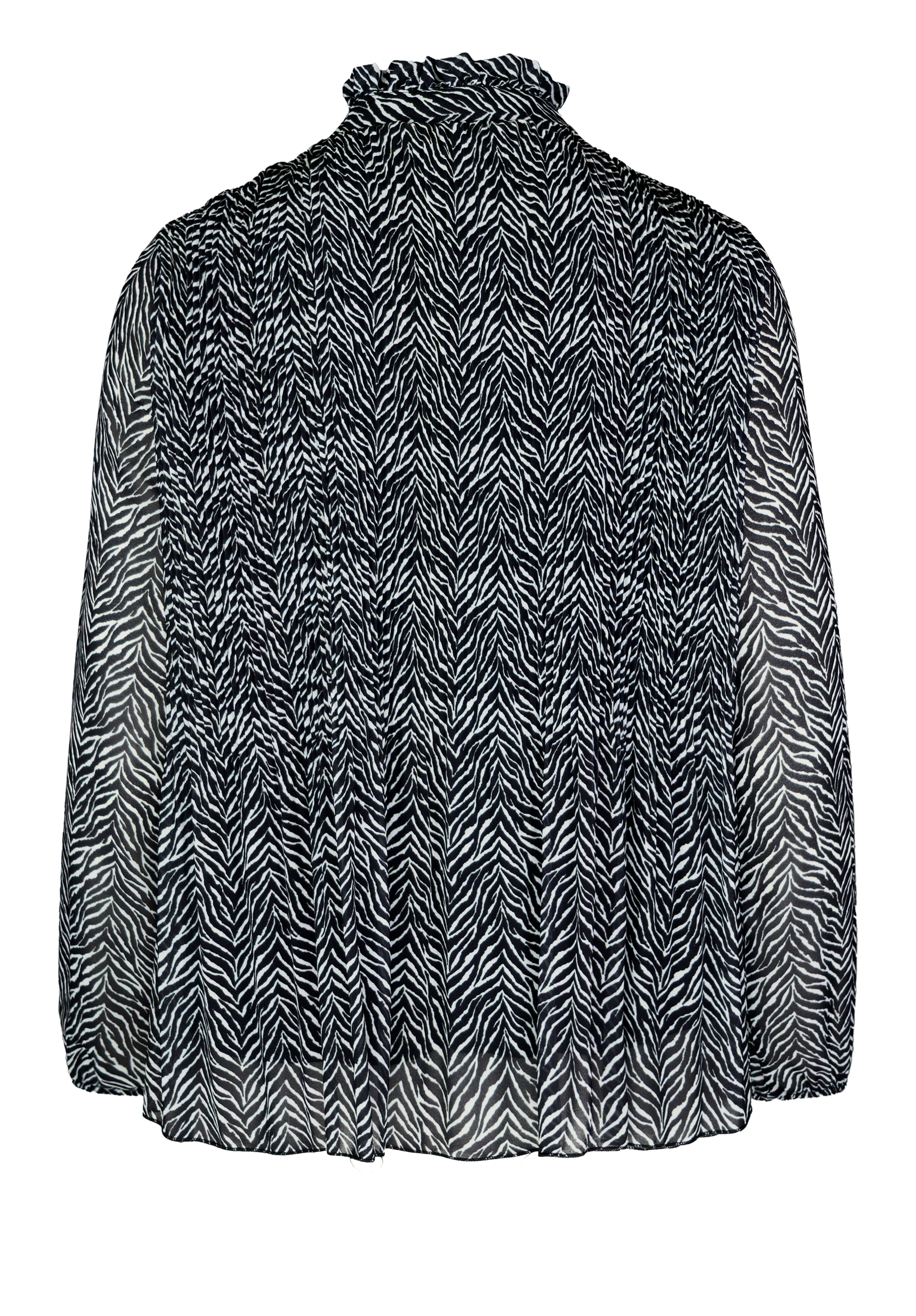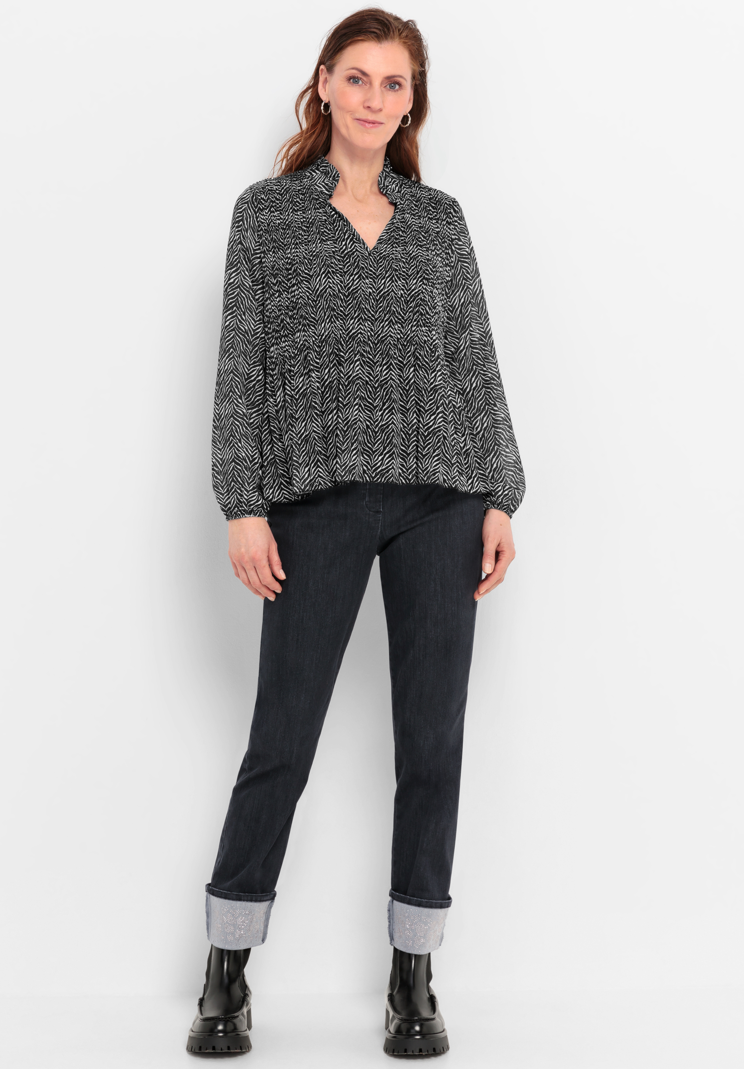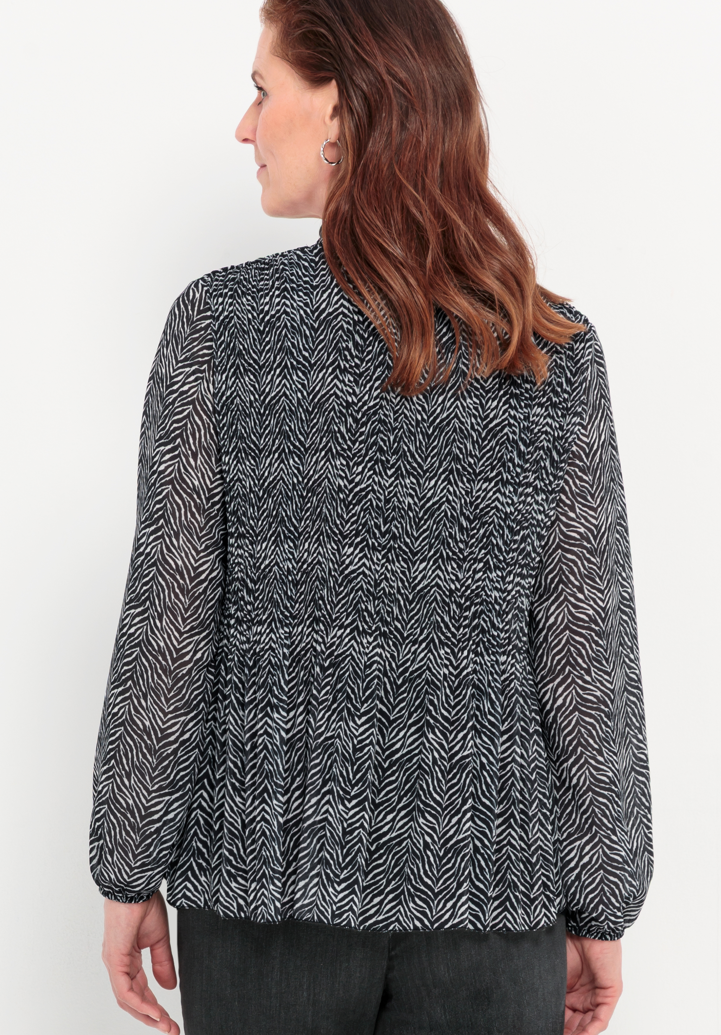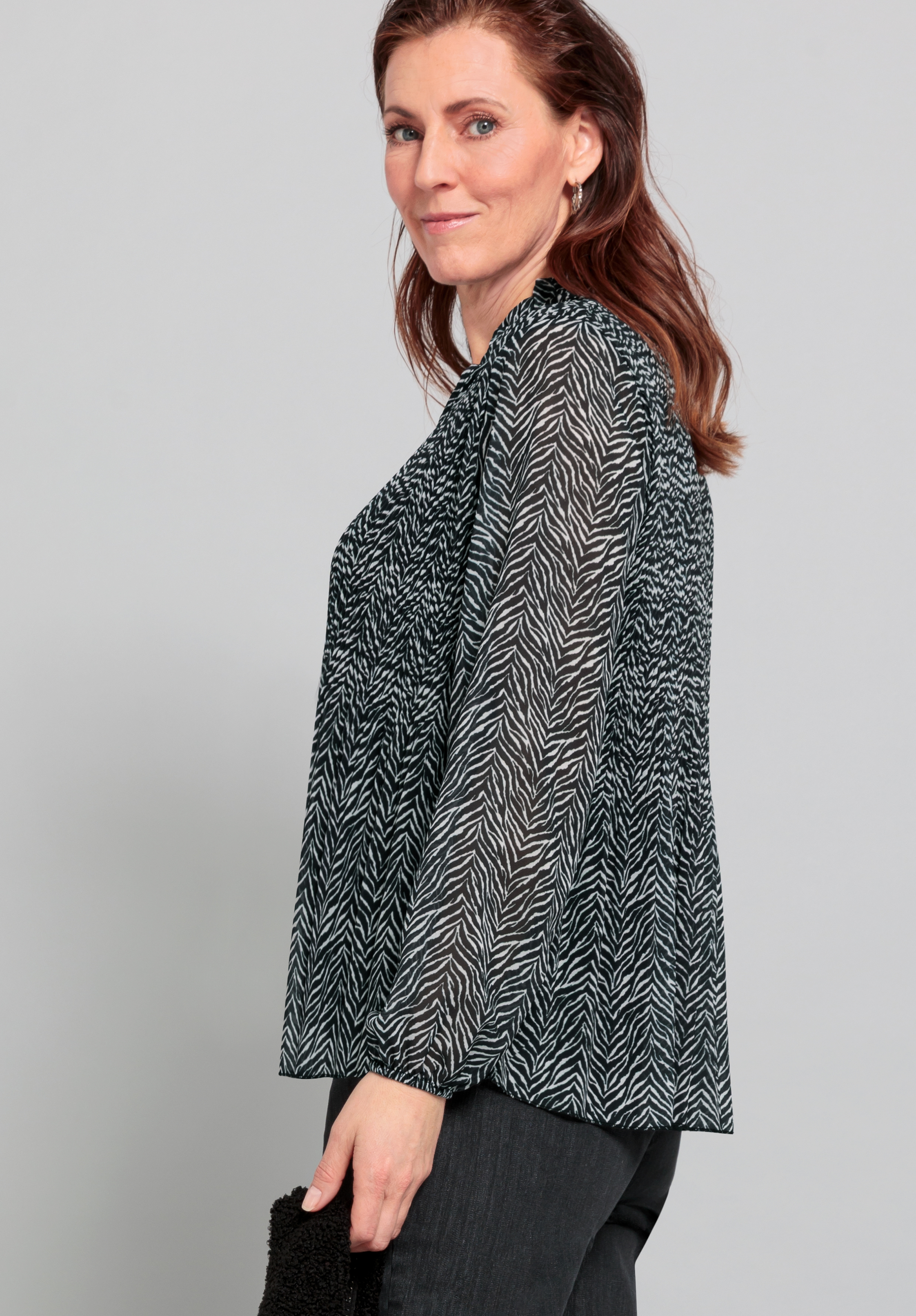 Stilvoll und modern! Unsere neue Plisseebluse Dorette überzeugt mit grafischem Schwarz-Weiß-Muster und locker fallender Passform. Unterfüttert ist die leicht transparente Bluse mit leichtem Viskosefutter. Der Tunika-Ausschnitt mit Stehkragen, zarter Raffung und Bindeband sowie die transparenten 3/4-Ärmel setzen feminine Akzente. Leicht, angenehm und vielseitig kombinierbar, diese Bluse ist Ihr neues Lieblingsstück für Büro und Freizeit.