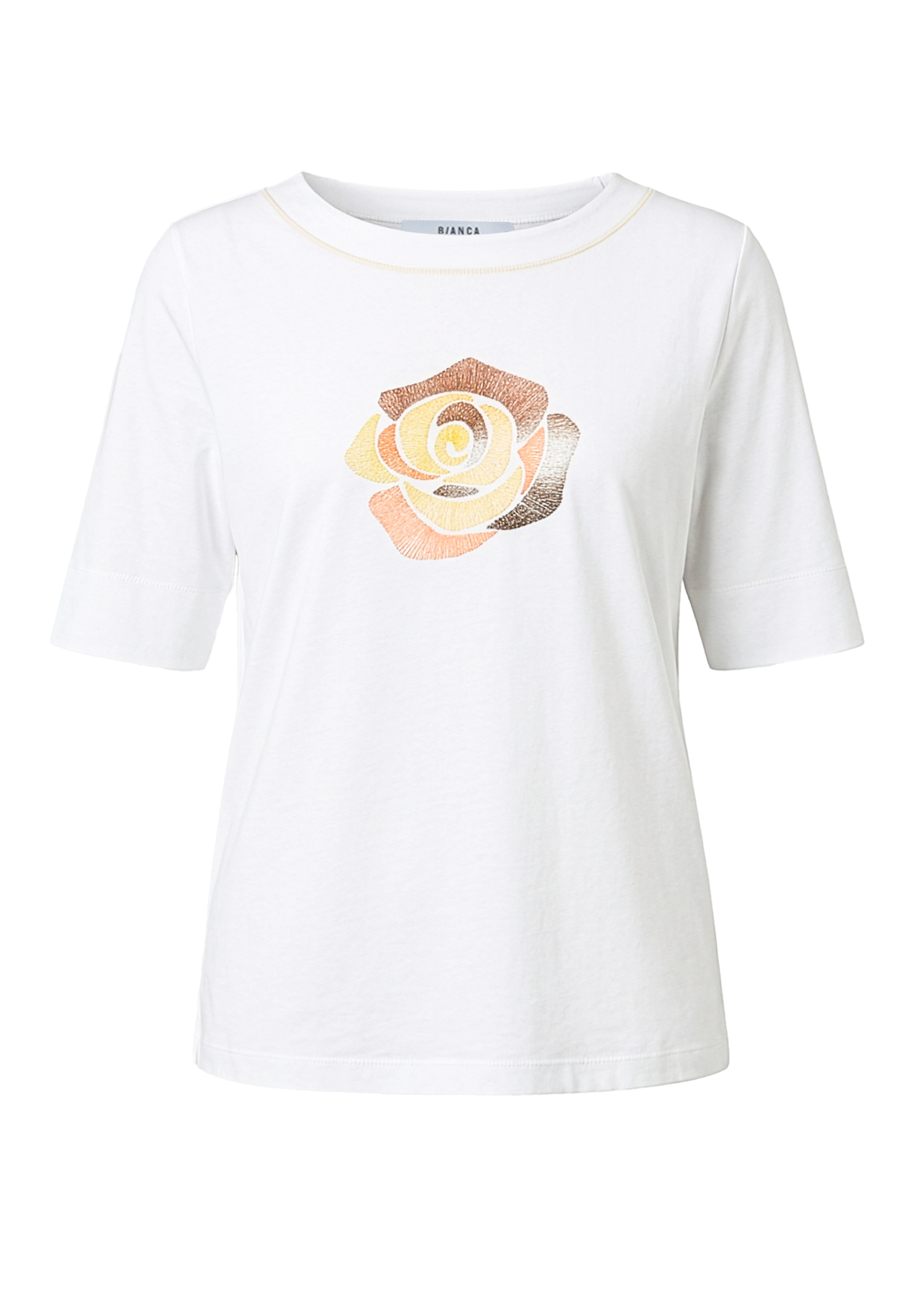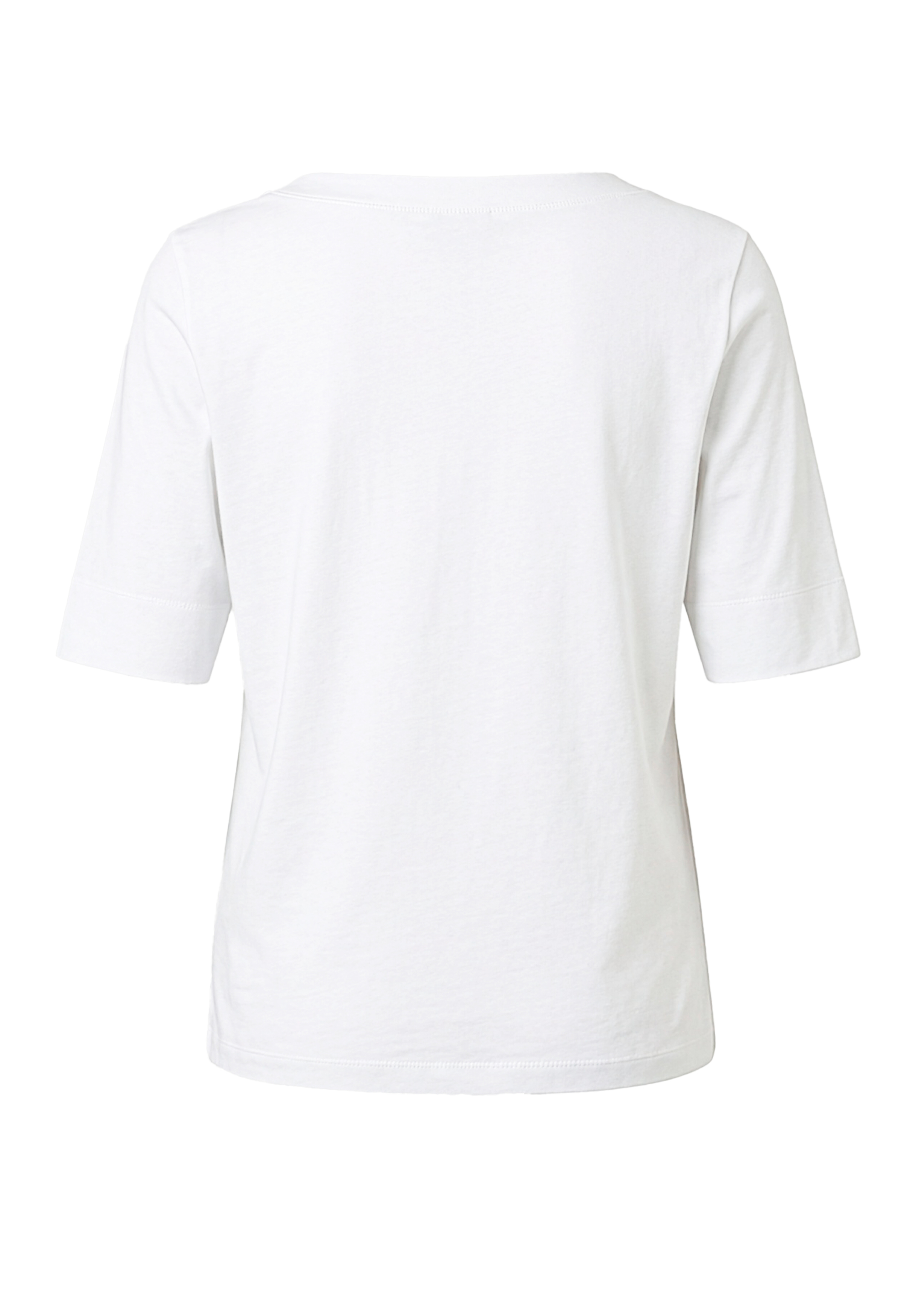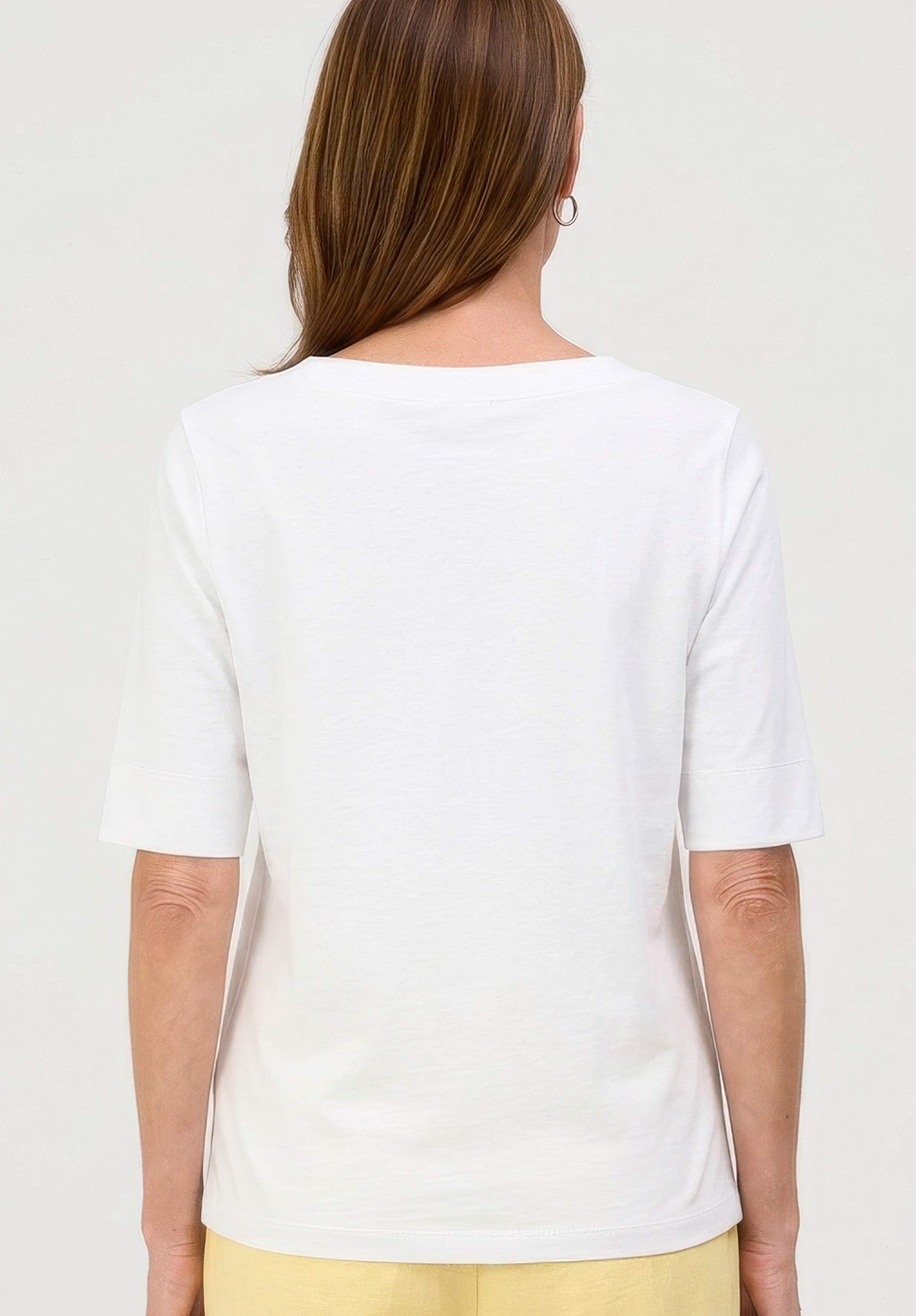 Ein perfekter Begleiter für jeden Tag: Unser cooles Print-Shirt Dinia überzeugt mit einem dezenten grafischen Blumenmotiv und zeitlosem Design. Der Rundhalsausschnitt mit breiter Blende verleiht dem Shirt eine moderne Note, während der Mailänder-Arm, ein etwas längerer, schmeichelnder 1/2-Arm, für eine feminine Silhouette sorgt. Der gerade Schnitt mit schmaler Passform sorgt für eine klare, moderne Silhouette. Gefertigt aus hochwertiger, reiner Baumwolle bietet das Print-Shirt Dinia angenehmen Tragekomfort und beste Qualität.