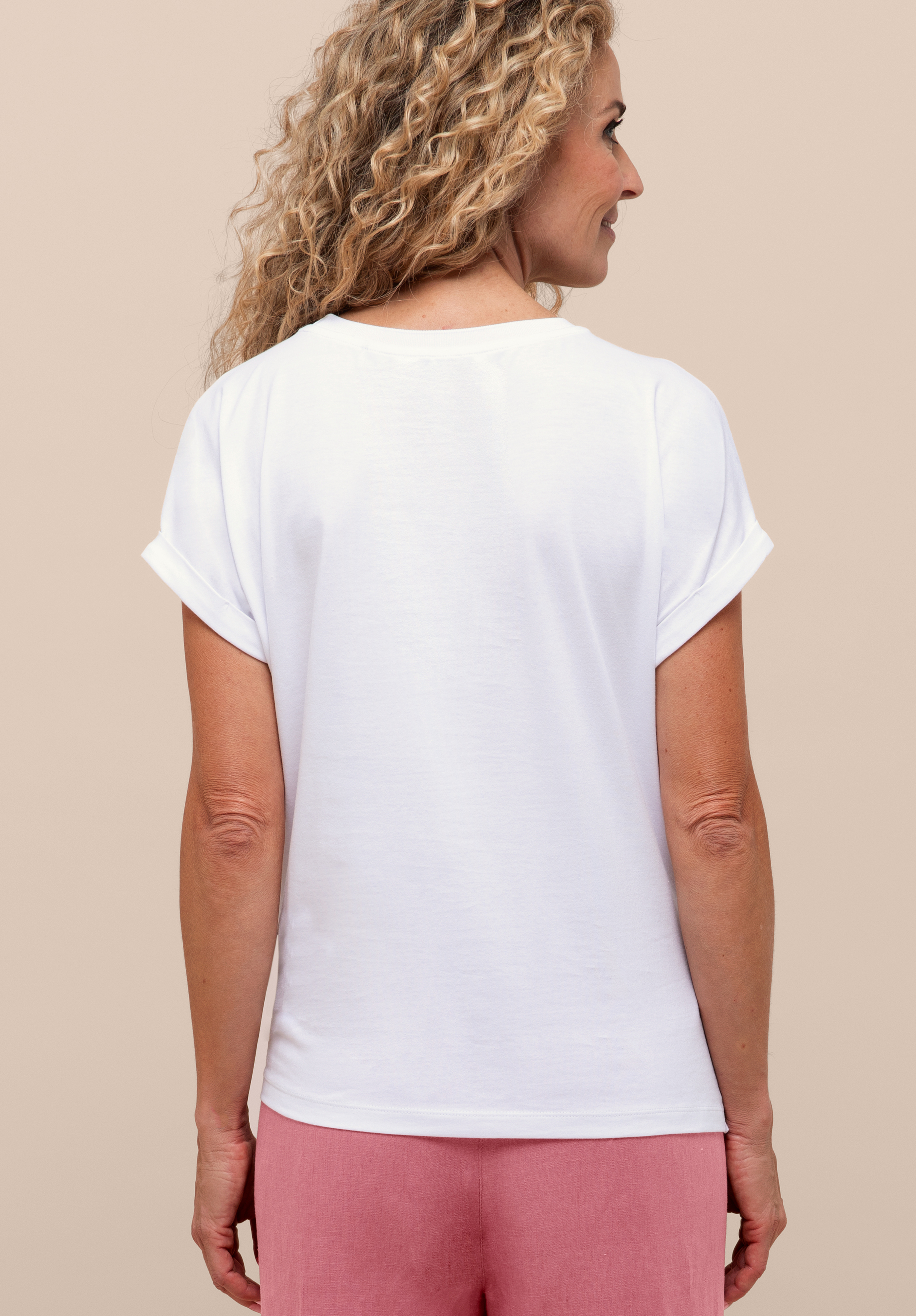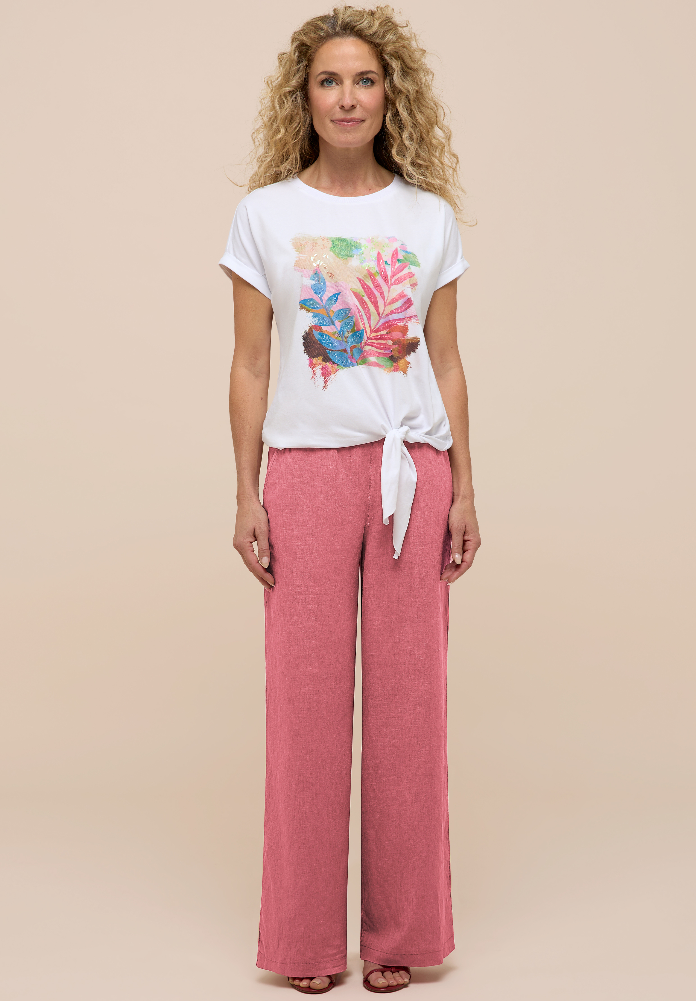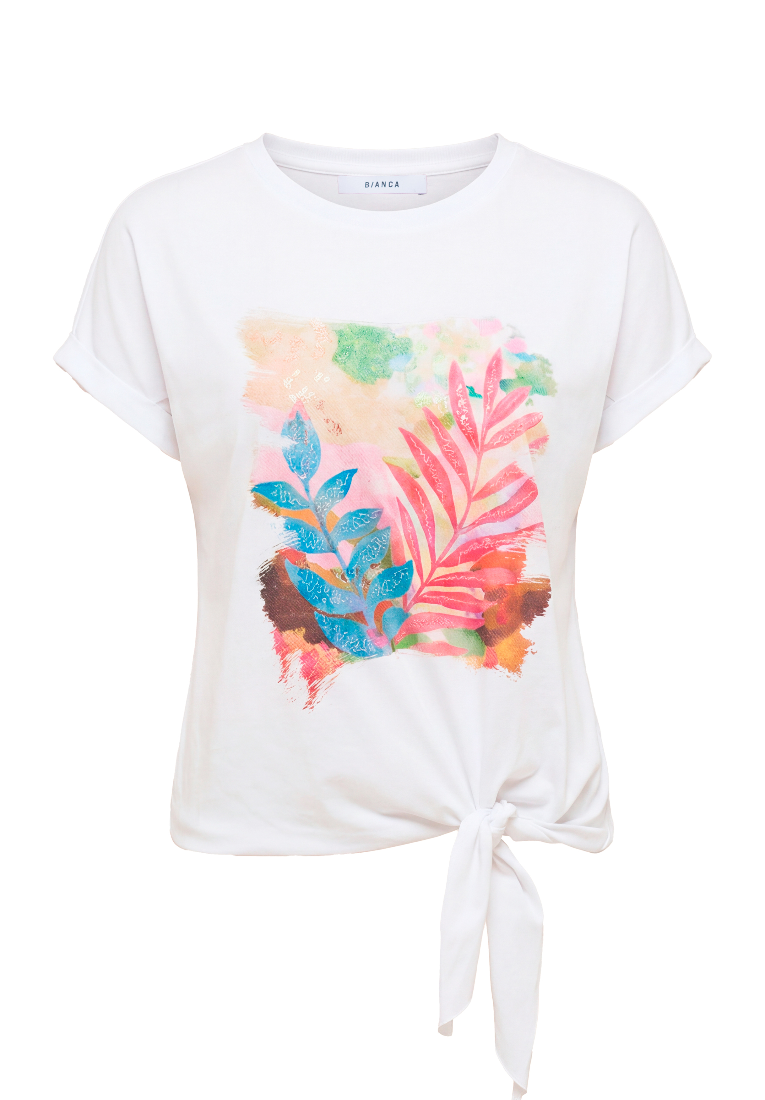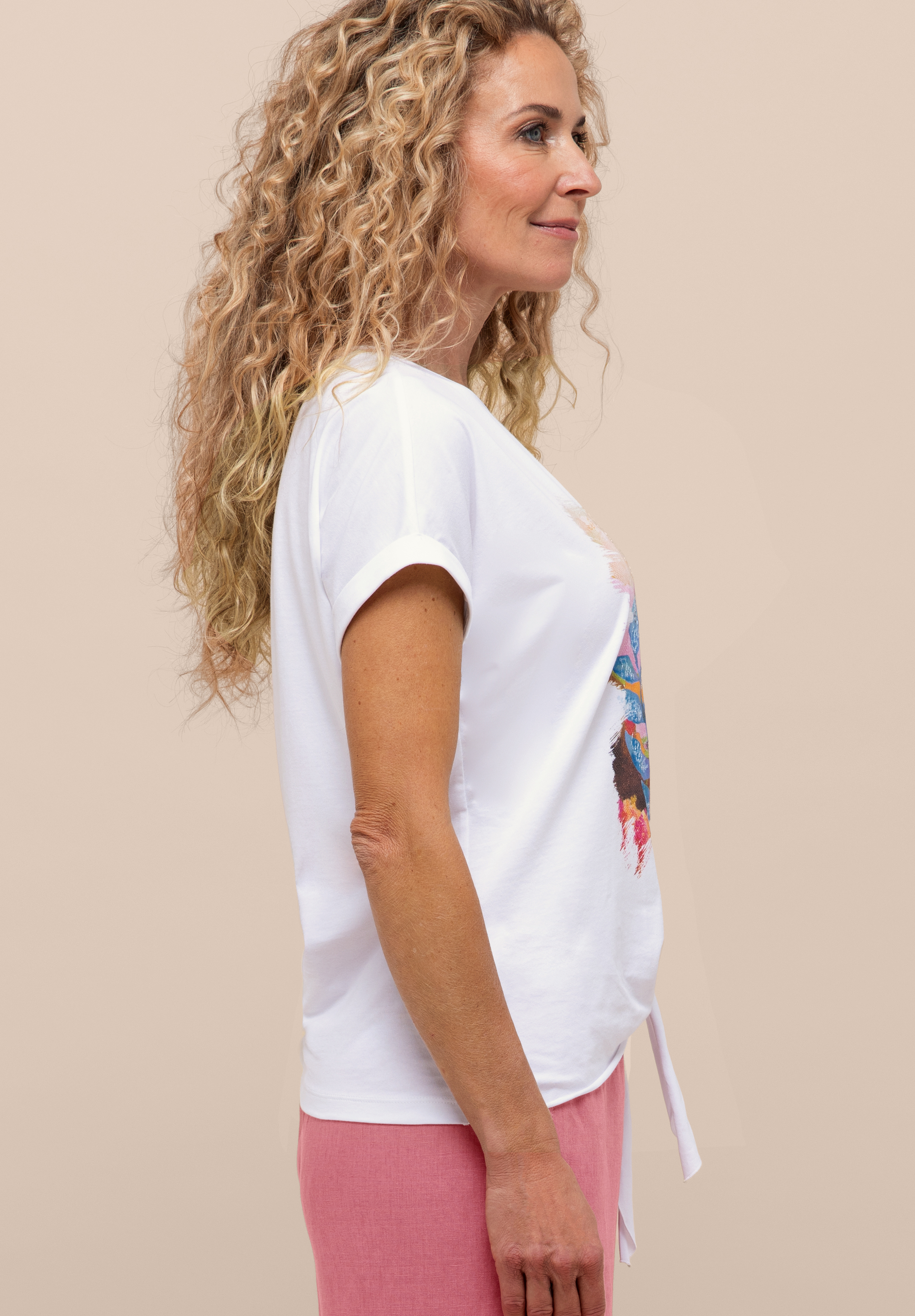 Unser neues Print-Shirt Julie bringt durch seinen farbigen Print mit schimmernden Pailletten sommerliche Leichtigkeit in Ihre Garderobe. Der klassische Rundhalsausschnitt mit Rippbündchen und der überschnittene Kurzarm mit kleinem Aufschlag setzen stilvolle Akzente. Die lockere Passform und das Knotendetail am Saum sorgt für einen angenehmen Sitz, während die weiche Baumwollqualität mit Elasthan besonders komfortabel ist. Ob lässig zur Jeansjacke oder schick unter einem Blazer - Julie ist ein vielseitiger Begleiter für sonnige Tage.