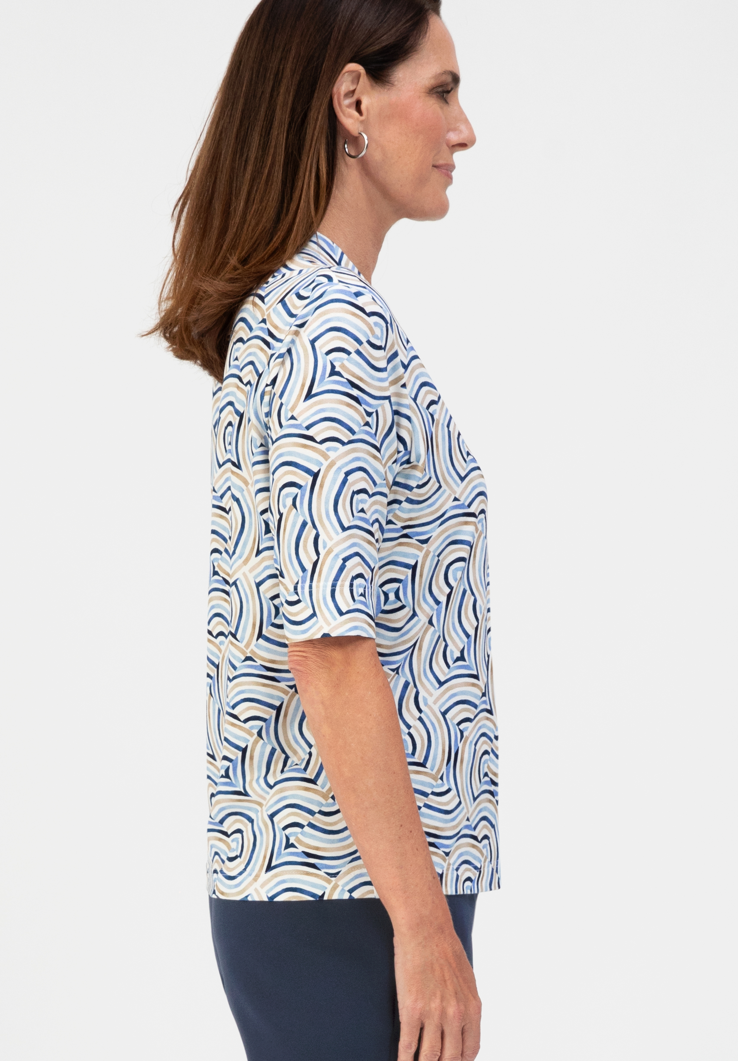 Frische Farben und ein modernes grafisches Dessin machen unser Print-Shirt Kayla zu einem vielseitigen Favoriten. Die weiche Viskose mit Elasthan sorgt für angenehmen Tragekomfort, während die gerade, schmalere Passform eine gepflegte Silhouette bietet. Ein V-Ausschnitt und der Mailänder-Arm ergänzen den Look. Durch das mehrfarbige Muster lässt sich Kayla unkompliziert zu vielen Unterteilen kombinieren, ideal für Büro, Alltag oder schicke Anlässe.