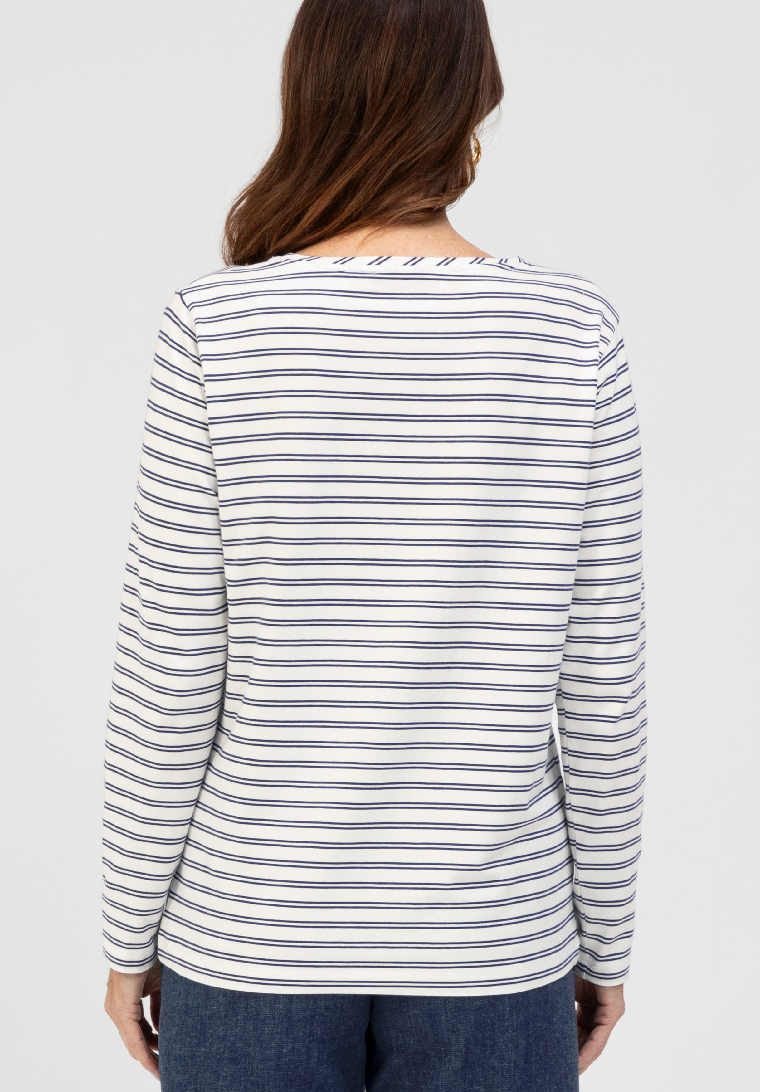Wir lieben Streifen! Unser neues Rundhalsshirt Dami überzeugt mit einem modernen Ringeldessin in klassischen Farben. Dank der hochwertigen Baumwolle mit Elasthan und der lockeren Passform trägt es sich besonders angenehm. Der Langarm und die kleine Logo-Stickerei vorne runden den Look perfekt ab. Dami ist ein lässiger Allrounder, der sich mühelos unter Jacken oder Blazern kombinieren lässt.