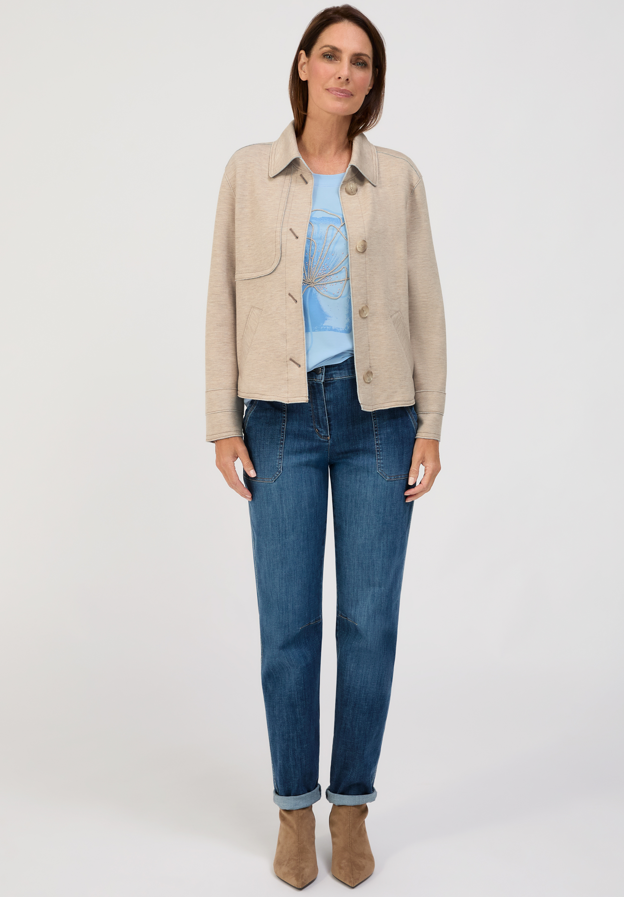 Unser neues Rundhalsshirt Dini überzeugt mit einem trendigen Frontmotiv, das durch eine hochwertige Kordelapplikation und dezente Schmucksteinchen veredelt wird. Der feminine Rundhalsausschnitt mit breit abgesteppter Blende und die 3/4-Ärmel runden das Design ab. Die Baumwollqualität mit Elasthan trägt sich angenehm und sorgt zusammen mit der geraden Passform für hohen Komfort. Ob unter einem Blazer oder kombiniert mit einer Jeansjacke, Dini ergänzt zahlreiche Looks mühelos.