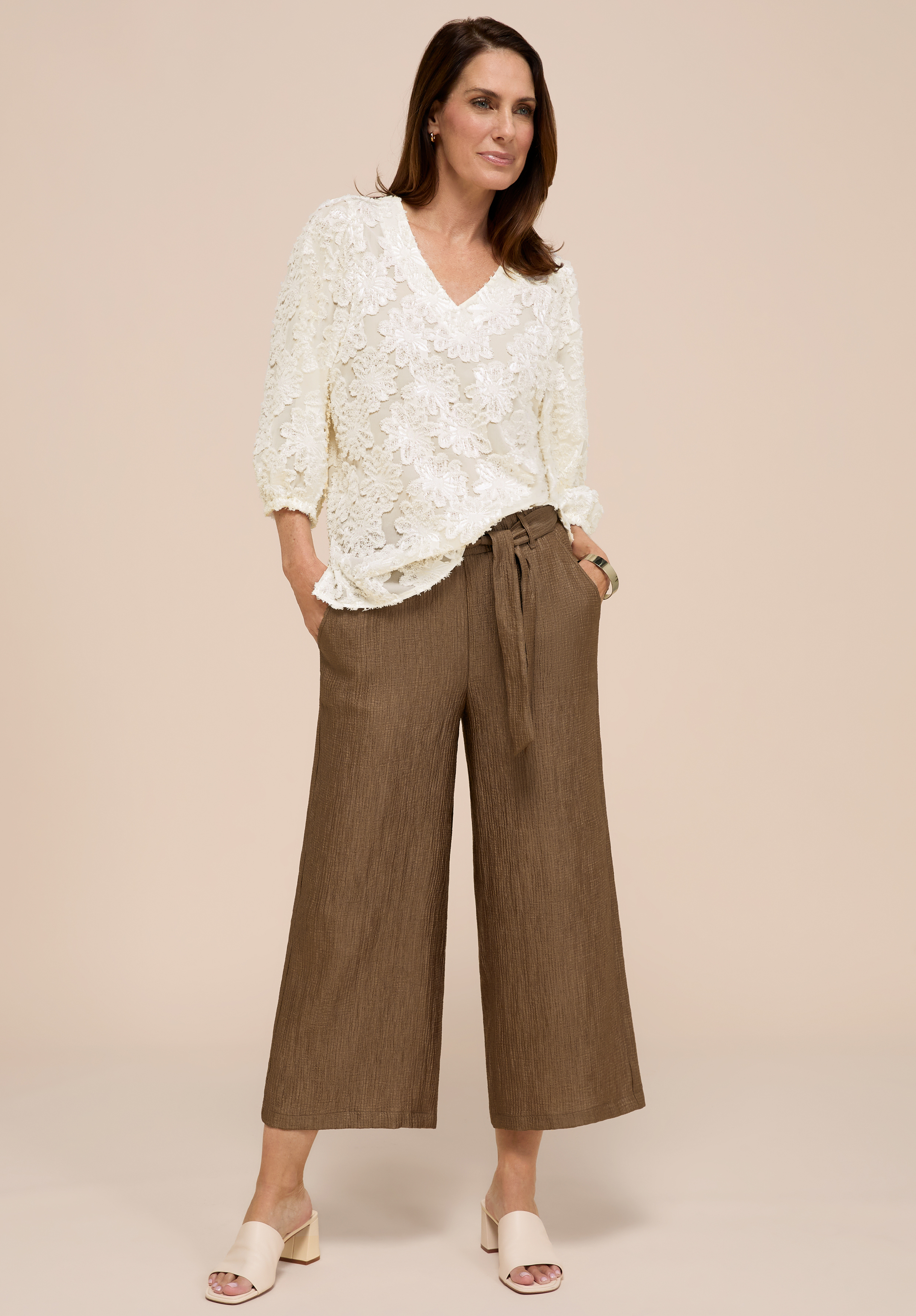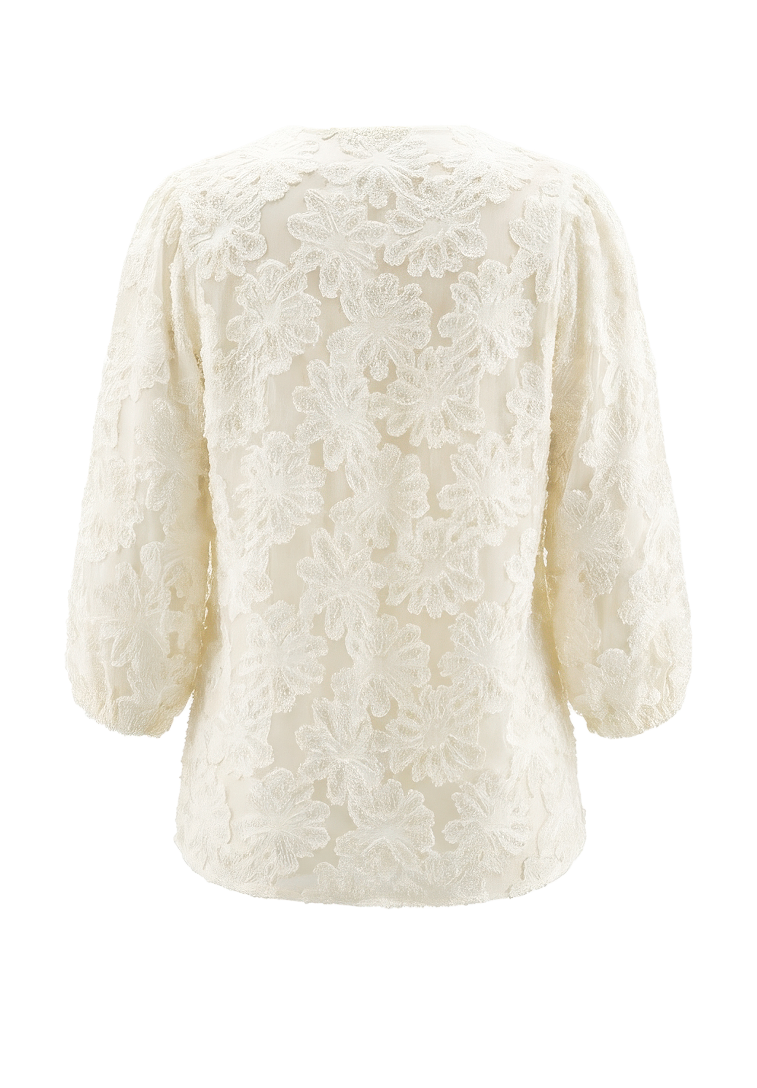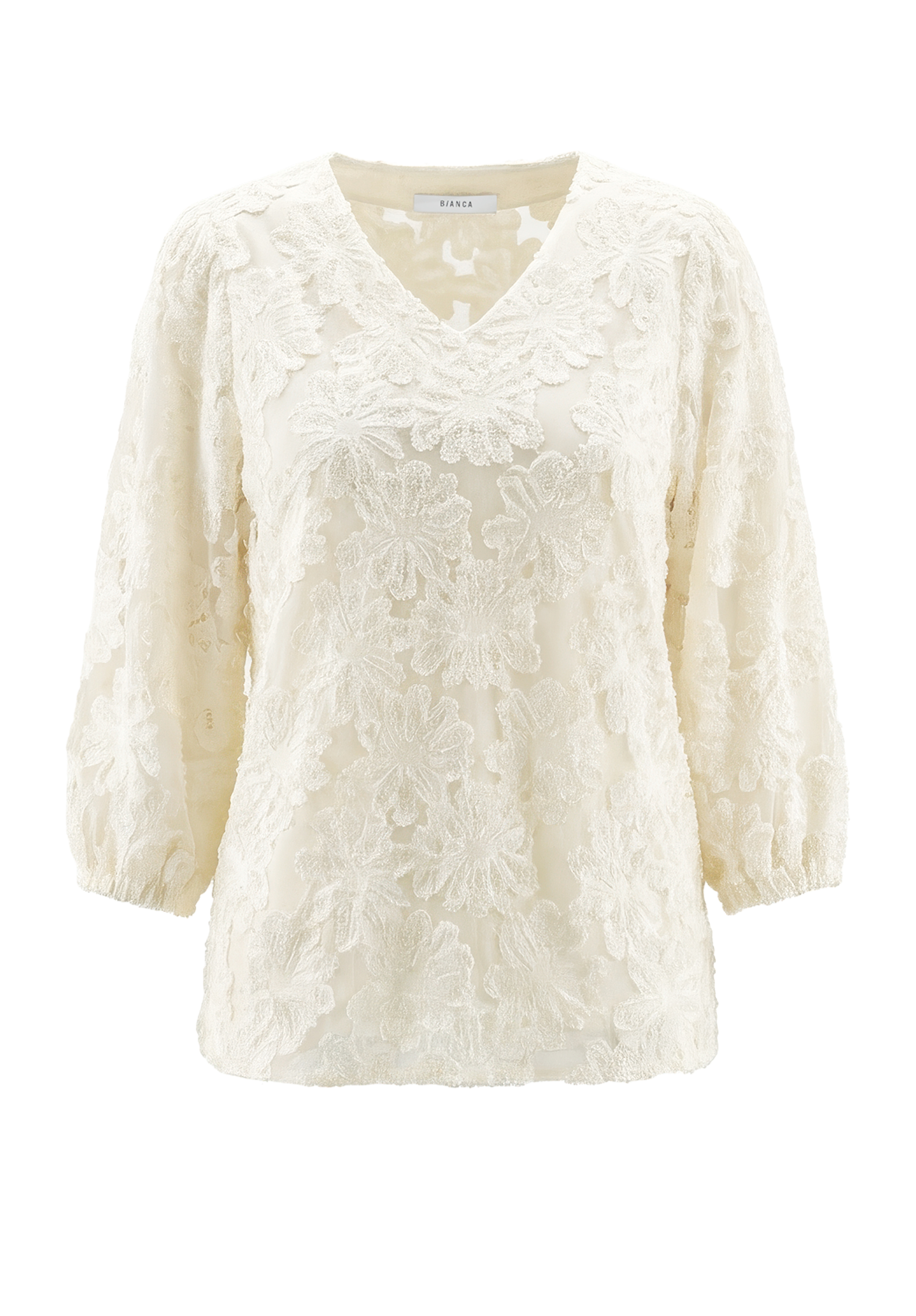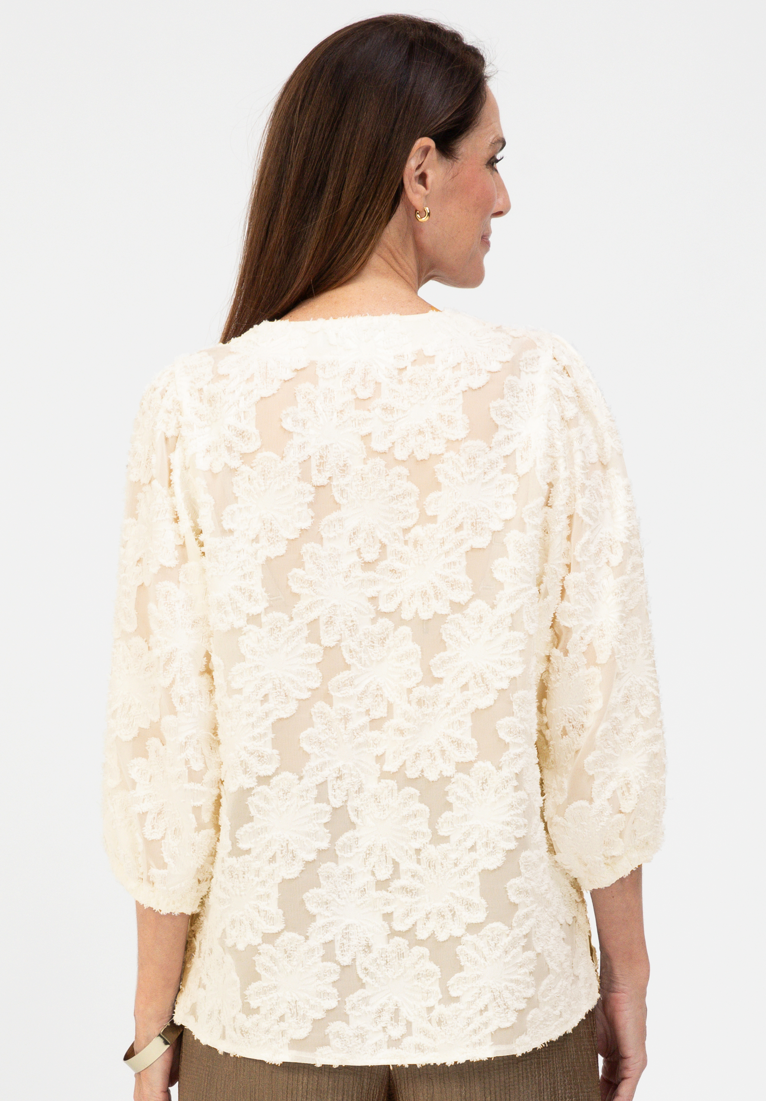 Unsere Schlupfbluse Alena begeistert mit einem femininen Look und angesagter Ausbrennerware in leicht transparenter Optik. Der V-Ausschnitt und die 3/4-langen Ärmel mit elastischen Bündchen verleihen der Bluse eine moderne, luftige Ausstrahlung. Die lockere Passform mit elastischem Saum sorgt für einen angenehmen Sitz und hohen Tragekomfort. Die hochwertige, pflegeleichte Qualität macht Alena zu einem vielseitigen Begleiter für stilvolle Alltags- und Sommerlooks.