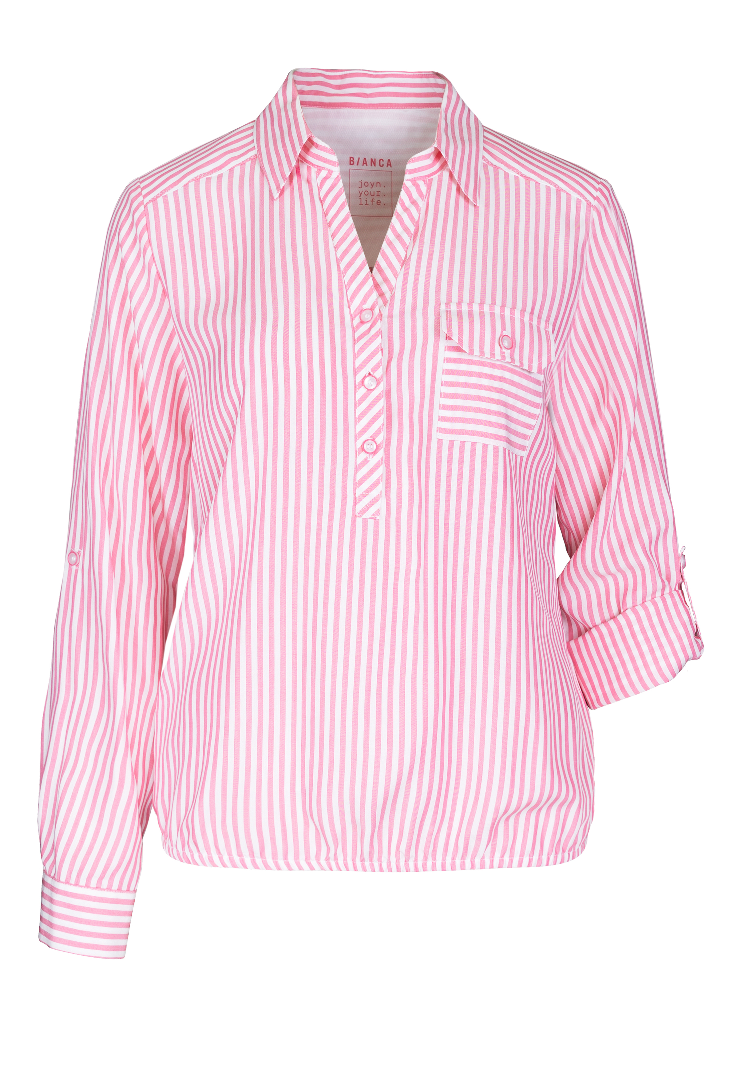 Unsere Schlupfbluse Anina überzeugt mit ihrem Streifen-Look in der aktuellen Trendfarbe. Aus 100 % Viskose gefertigt, bietet sie zusammen mit der lockeren Passform ein angenehmes Tragegefühl. Der Polokragen mit halber Knopfleiste, die kleine Brusttasche und der Gummizug am Saum verleihen der Bluse ihren lässigen Charme. Die langen Ärmel können praktisch zum 3/4-Arm hochgekrempelt werden. Vielseitig kombinierbar, macht Anina sowohl im Business-Look mit Blazer und Hose als auch in der Freizeit mit Sneakern und Jeans eine gute Figur.