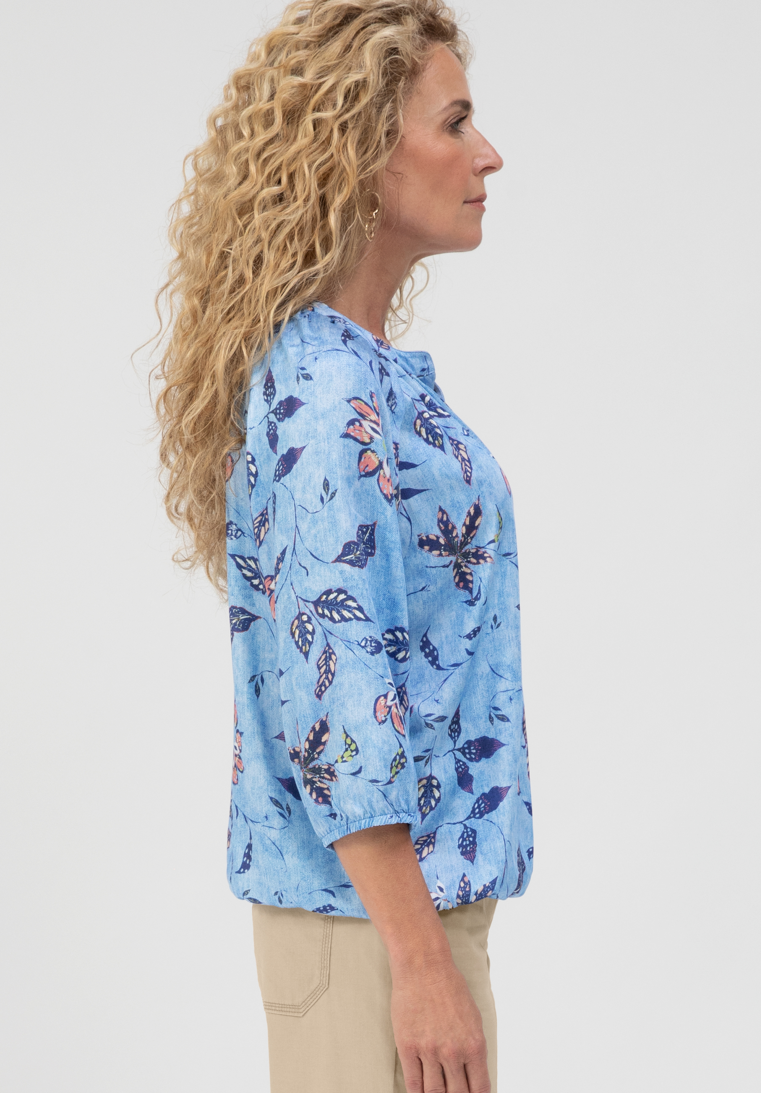 Unsere coole Schlupfbluse Rana bringt frischen Schwung in Ihre Garderobe. Das angesagte florale Allover-Dessin und der Rundhalsausschnitt mit kleinem Schlitz setzen modische Akzente. Der 3/4 Arm mit Gummizug sowie der elastische Saum sorgen für eine lockere, bequeme Passform. Aus 100 % Viskose gefertigt, trägt sich Rana angenehm leicht und ist ein vielseitiger Begleiter für stilvolle Alltagslooks.