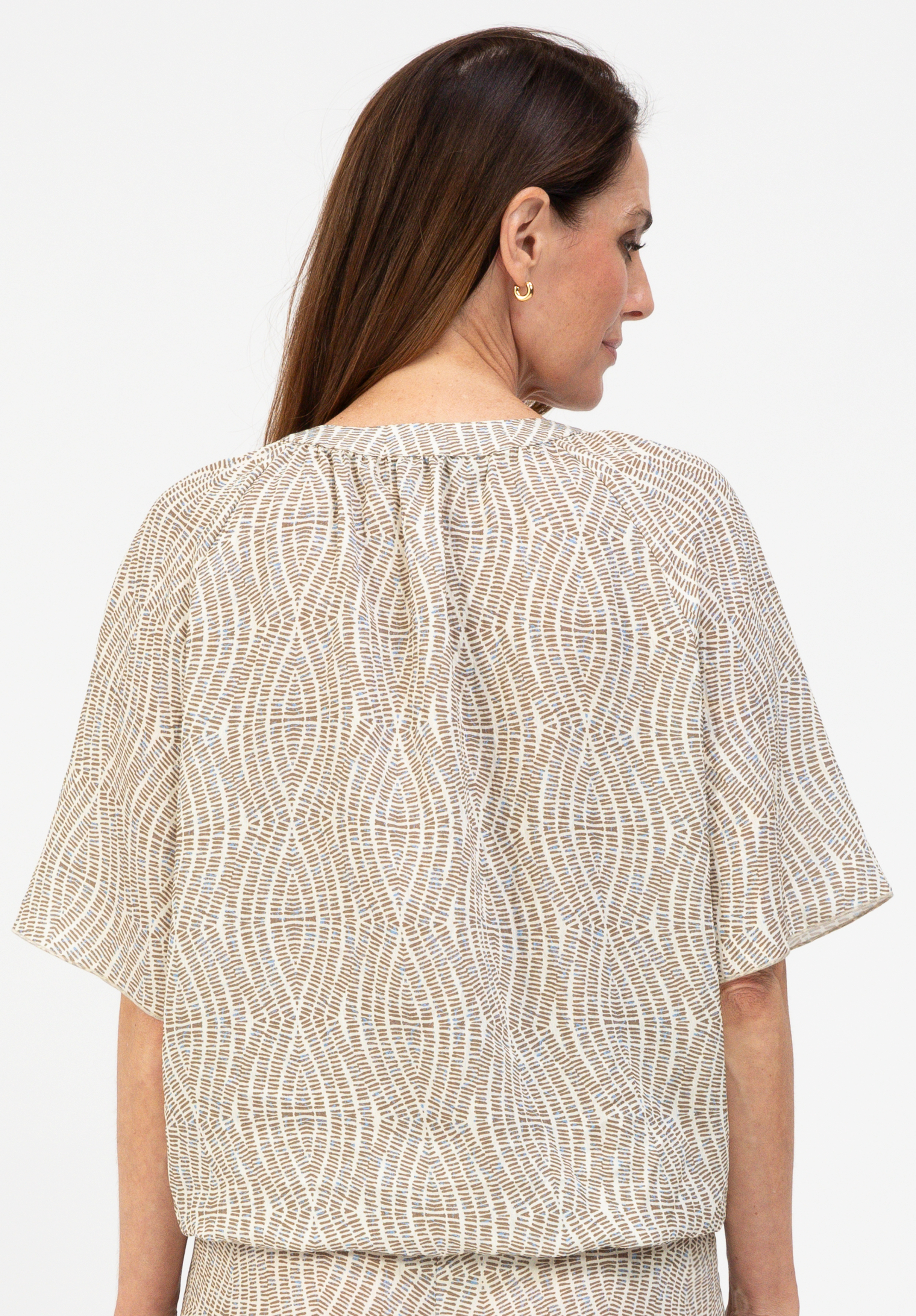 Unsere moderne Schlupfbluse Rani ist der perfekte Begleiter für sommerliche Tage. Mit ihrem tonigem Allover-Print setzt sie modische Akzente. Der Rundhalsausschnitt mit kleinem V-Cut-Out und die 1/2 Ärmel runden das Design ab. Dank des hochwertigen Materialmix bietet die Bluse ein angenehmes Tragegefühl, während die lockere, gerade Passform für Lässigkeit sorgt. Ob für den Alltag oder besondere Anlässe - Rani ist die ideale Ergänzung für vielseitige Outfits.