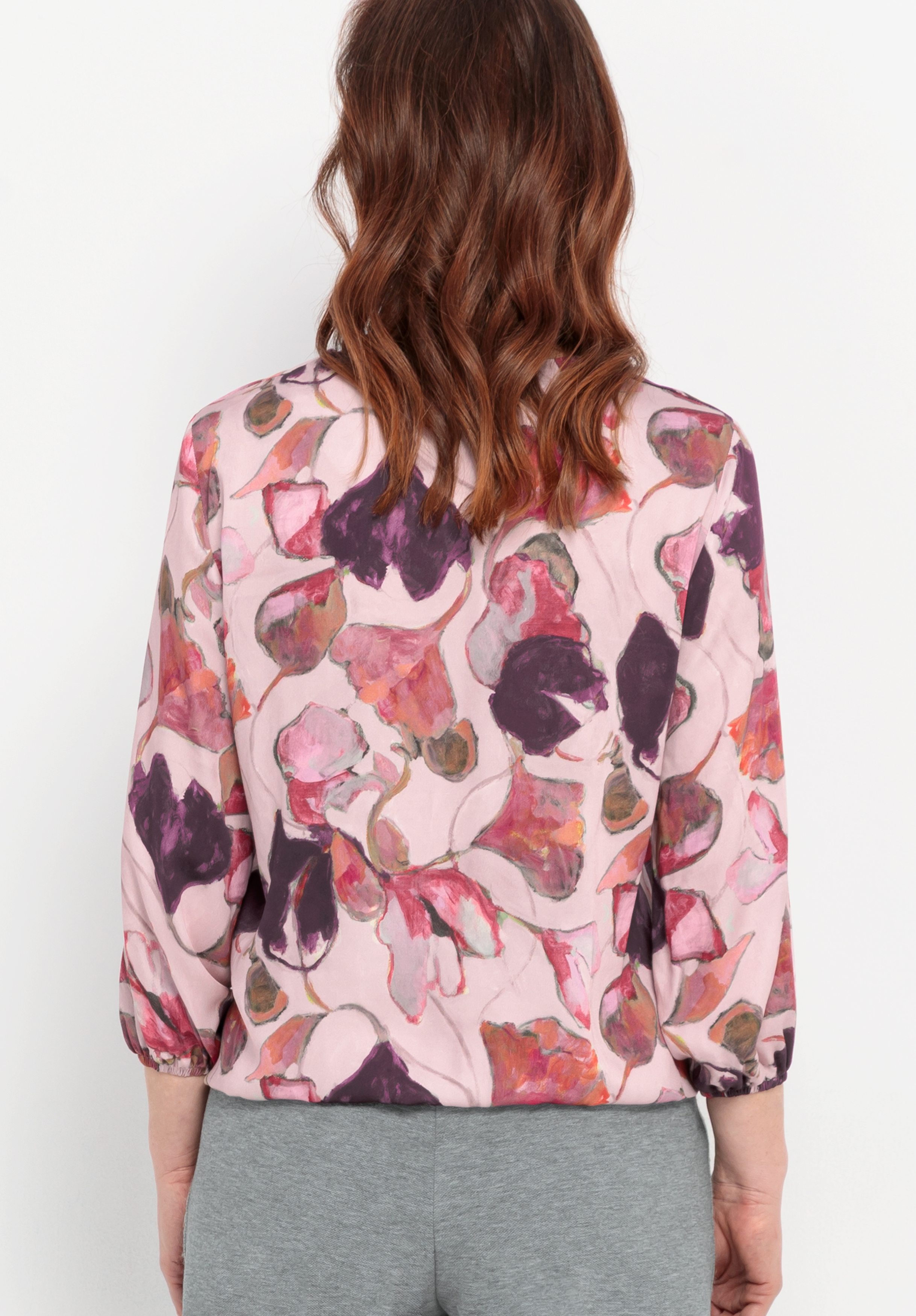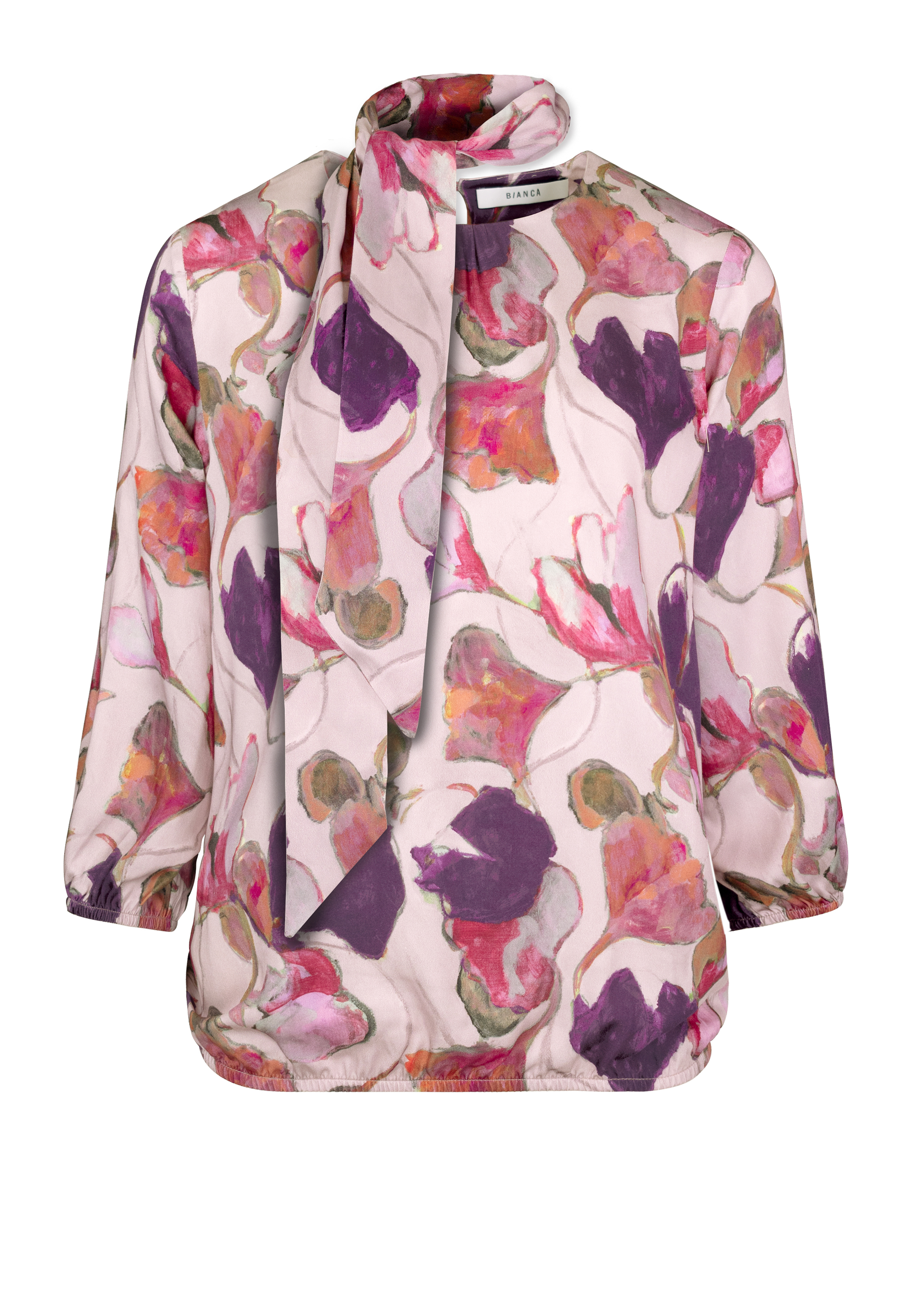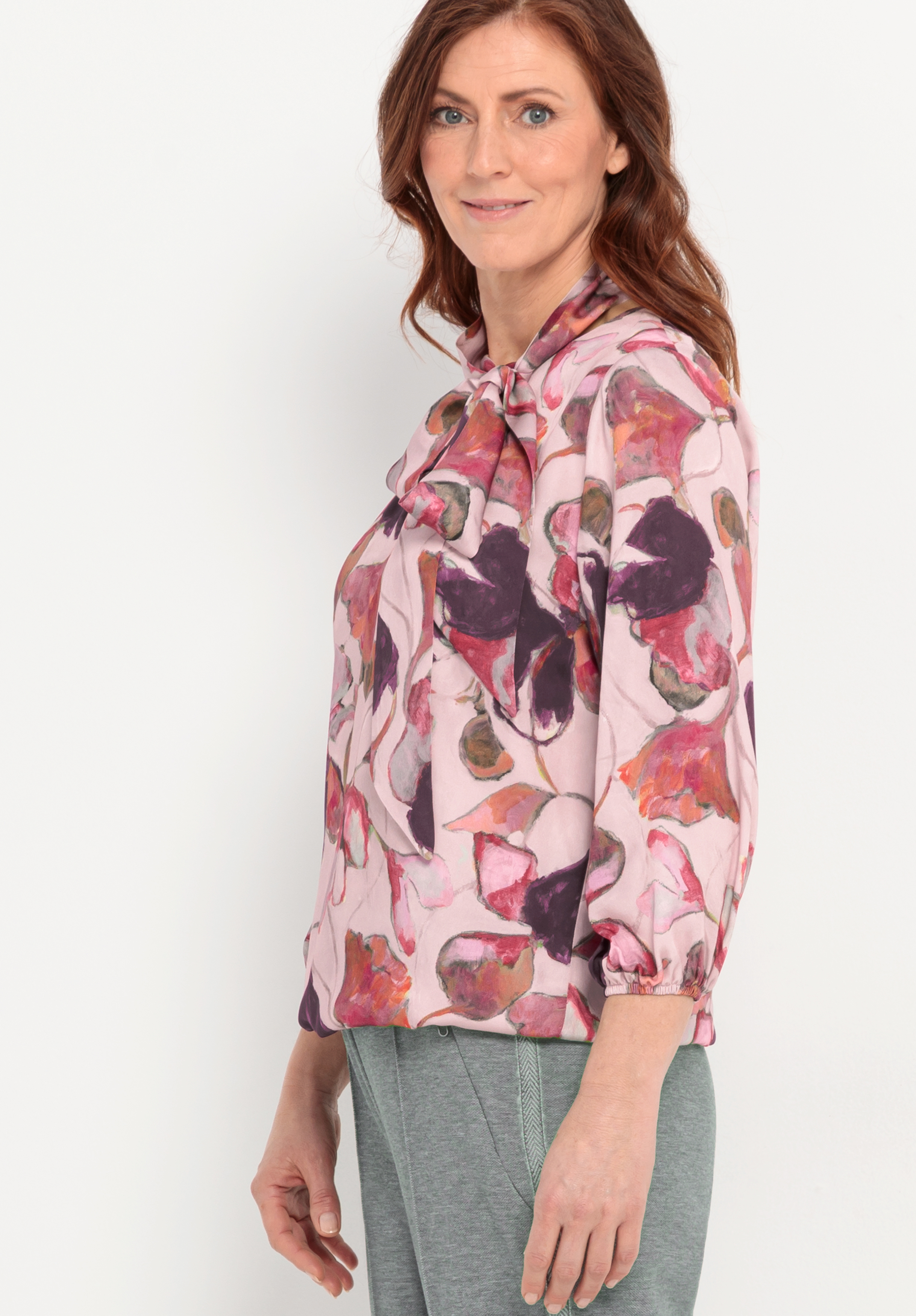 Unsere moderne Schluppenbluse Alana, ein echtes Highlight für Ihre Garderobe! Der florale Druck in Trendfarben und das Schleifenband am Rundhalsausschnitt setzen modische Akzente. Dezente Kräuselungen vorne am Aausschnitt und der kleine Knopfverschluss am Rücken verleihen eine feminine Note. Der 3/4 Arm mit Gummibund und der elastische Saum sorgen für eine lockere Passform. Dank der pflegeleichten Qualität trägt sich Alana angenehm und vielseitig, ob elegant gebunden oder lässig geknotet.
