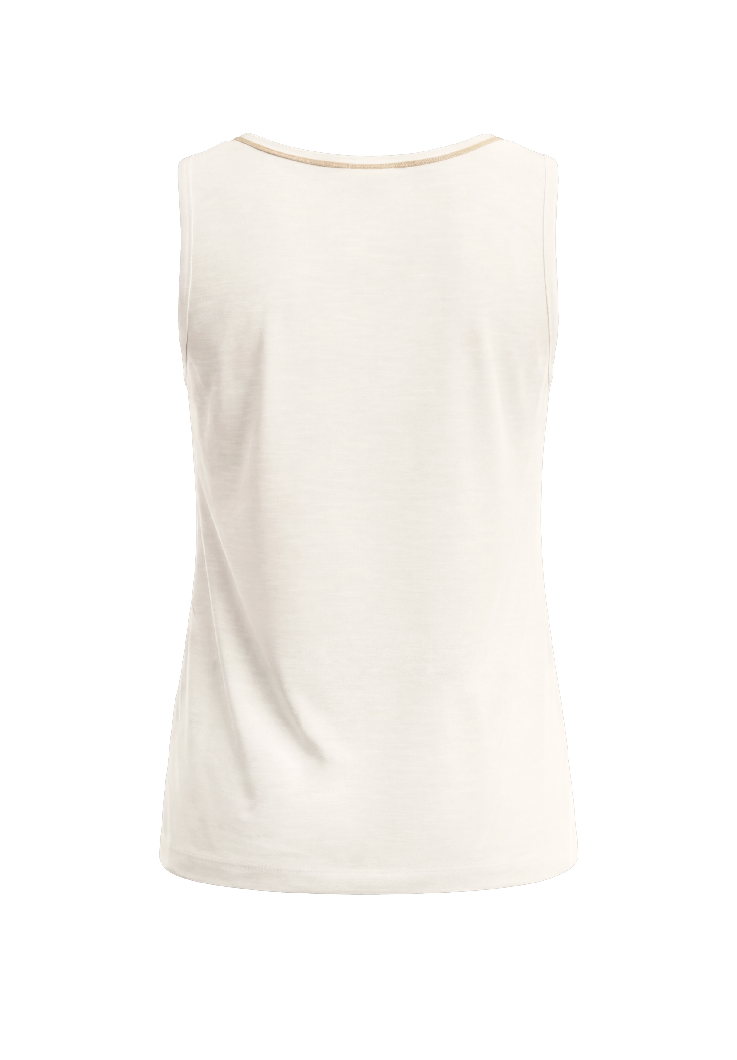 Ein eleganter Allrounder für viele Gelegenheiten! Unser Shirttop Selis zeigt sich in zeitlosem "ivory" mit goldener Biese am Rundhals-Ausschnitt - perfekt für einen stilvollen Auftritt. Die breiten Träger, die gerade, lockere Passform und die hochwertige Baumwollqualität sorgen für angenehmen Tragekomfort und runden das Design edel ab. Kombiniere Selis elegant zu Rock und Sandalen, oder sportlich zu Jeans und Sneakern.