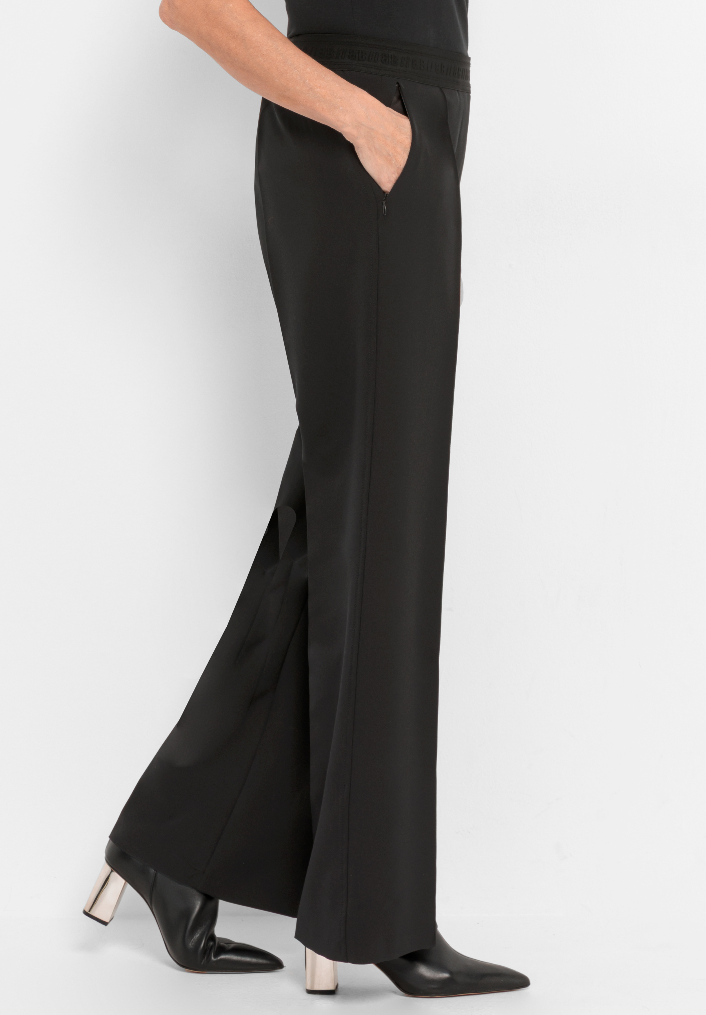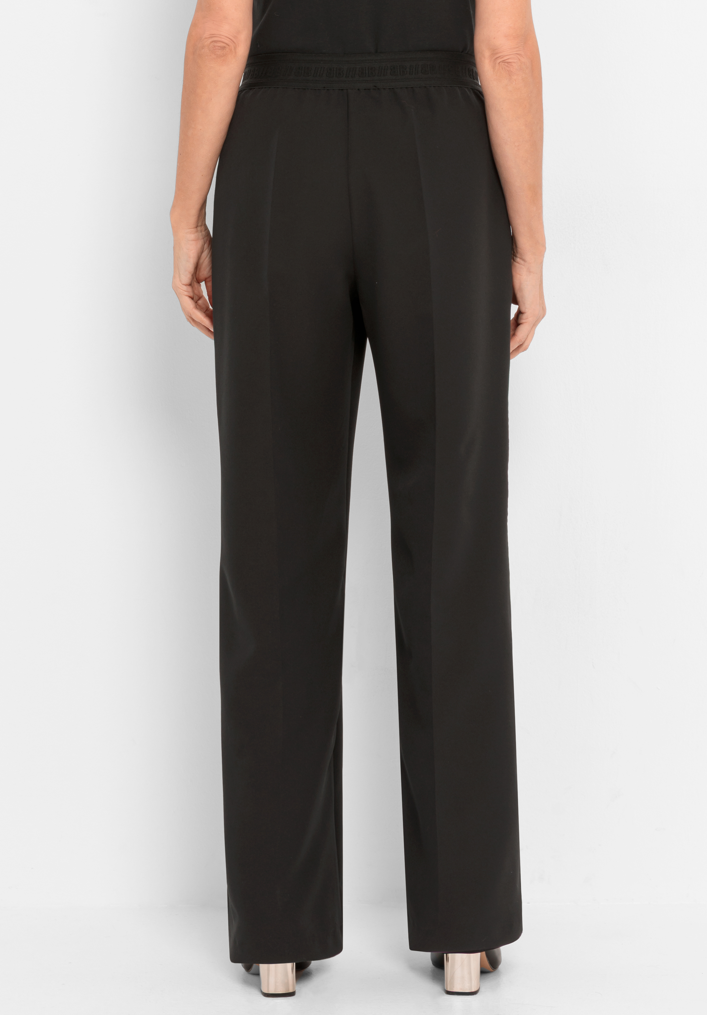 Zeitlos und modern! Unsere schwarze Stretch-Hose Parigi punktet mit ihrer geraden, langen Passform, den edlen abgesteppten Biesen und praktischen Zippertaschen. Der Logo-Gummibund sorgt für bequemen Sitz und macht die Hose zu einem vielseitigen Stylingpartner. Pflegeleichter Materialmix mit Elasthan schenkt angenehmen Tragekomfort und Bewegungsfreiheit. Elegant und unkompliziert, Parigi ist ein echtes Must-have für Ihre Garderobe.
