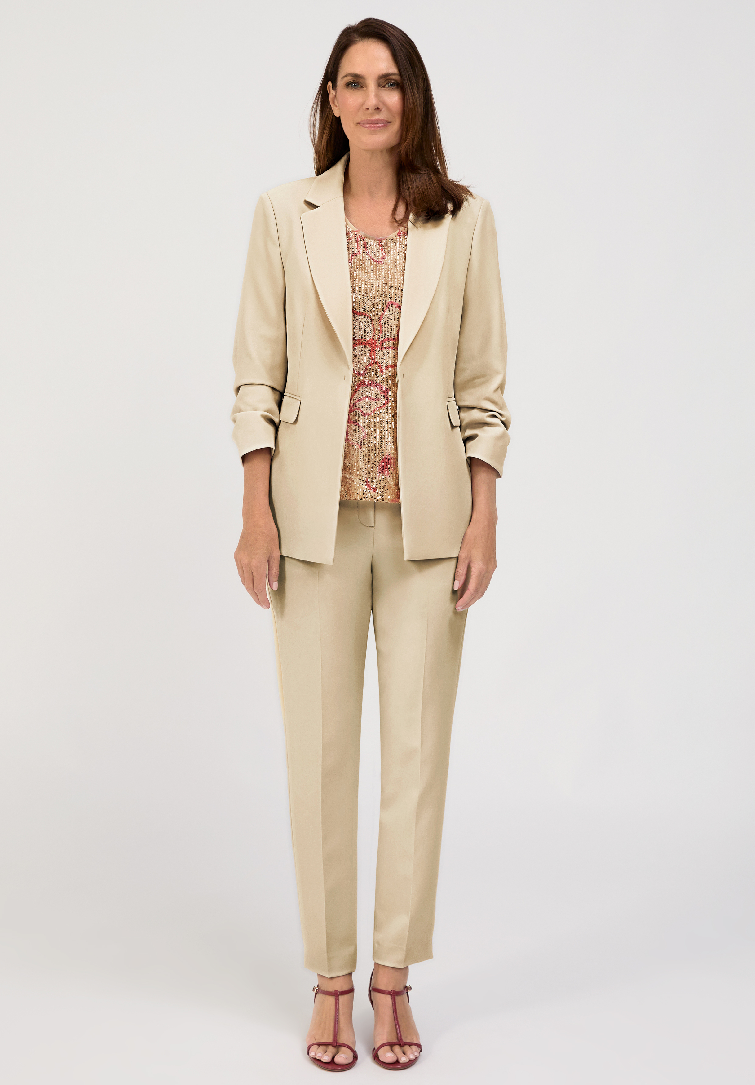 Mit ihrem gepflegten und zugleich modischen Look ist unsere neue Stretch-Hose Siena ein vielseitiger Allrounder für zahlreiche Gelegenheiten. Der hochwertige Materialmix mit Elasthan und das schmal geschnittene Bein sorgen für ein angenehmes Tragegefühl und hohen Komfort. Eine bequeme Passform mit innenliegendem elastischem Gummibund, klassische Bügelfalte, praktische Reißverschlusstaschen sowie seitliche Saumschlitze runden das Design harmonisch ab. Siena lässt sich vielseitig kombinieren, elegant mit passendem Blazer und Bluse oder lässig mit Shirt und Sneakern - und ist damit ideal für jeden Anlass.