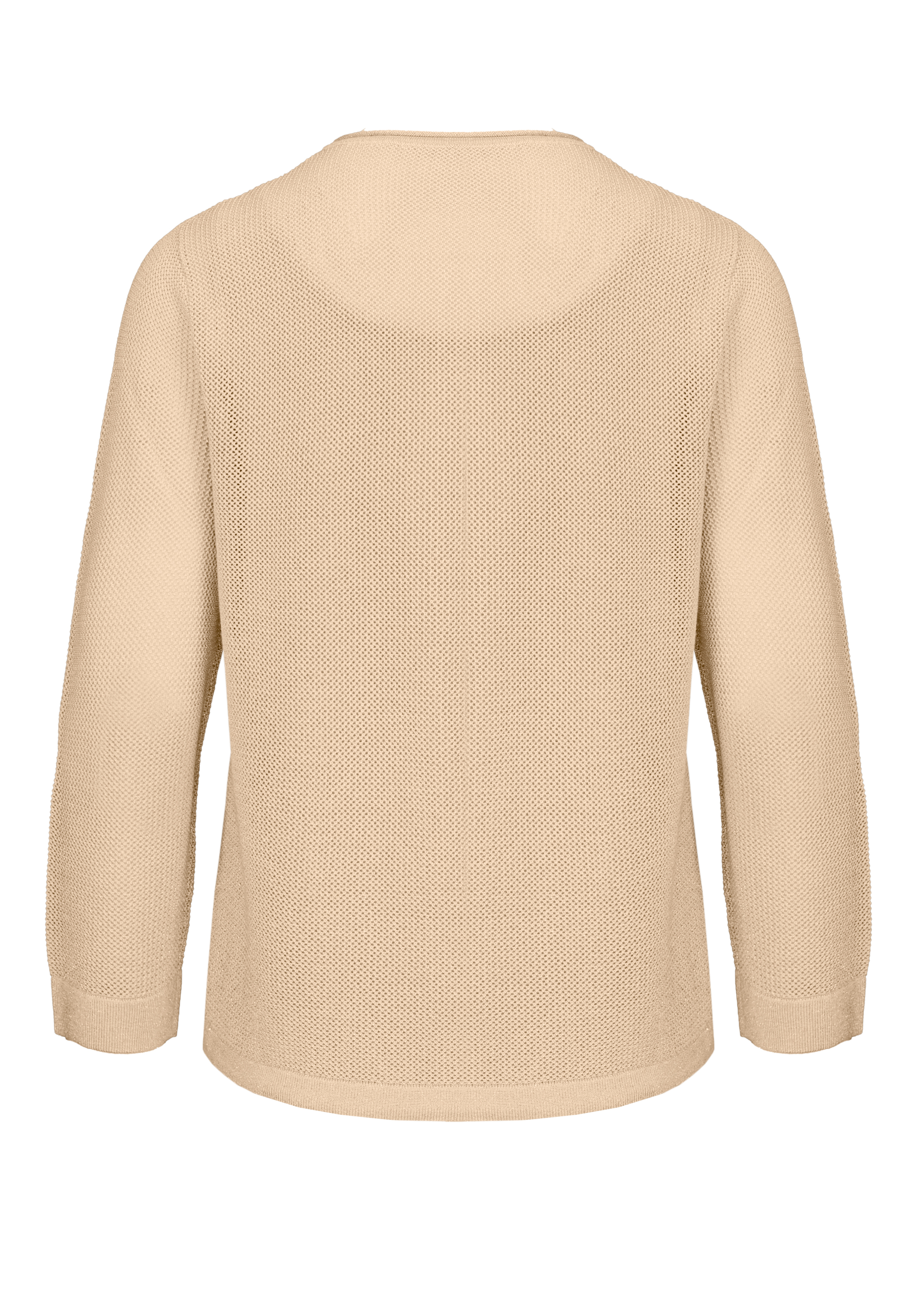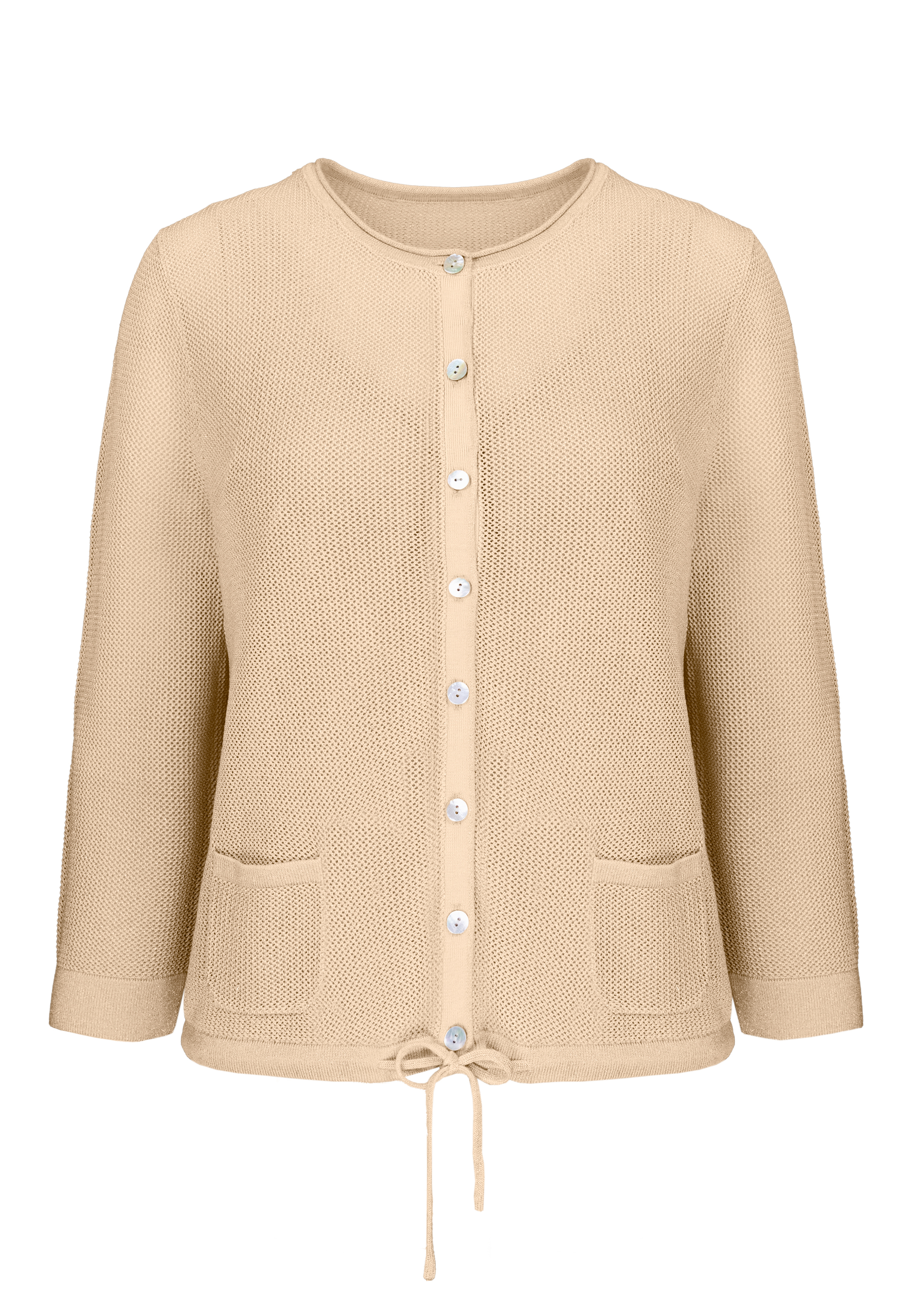 Unsere Strickjacke Rene - moderner Look mit liebevollen Details! Das angesagte Lochstrickmuster mit dezent schimmerndem Effekt und der Tunnelzug am Saum machen Rene zu einem echten Highlight. Die modischen 3/4-Ärmel, aufgesetzte Taschen, die Knopfleiste und der Rundhalsausschnitt mit kleiner Rollkante unterstreichen den femininen Stil. Dank des hochwertigen Materialmixes und der lockeren Passform ist sie besonders angenehm zu tragen - perfekt für entspannte Alltags-Outfits oder als stilvoller Begleiter zu Kleidern und Blusen.