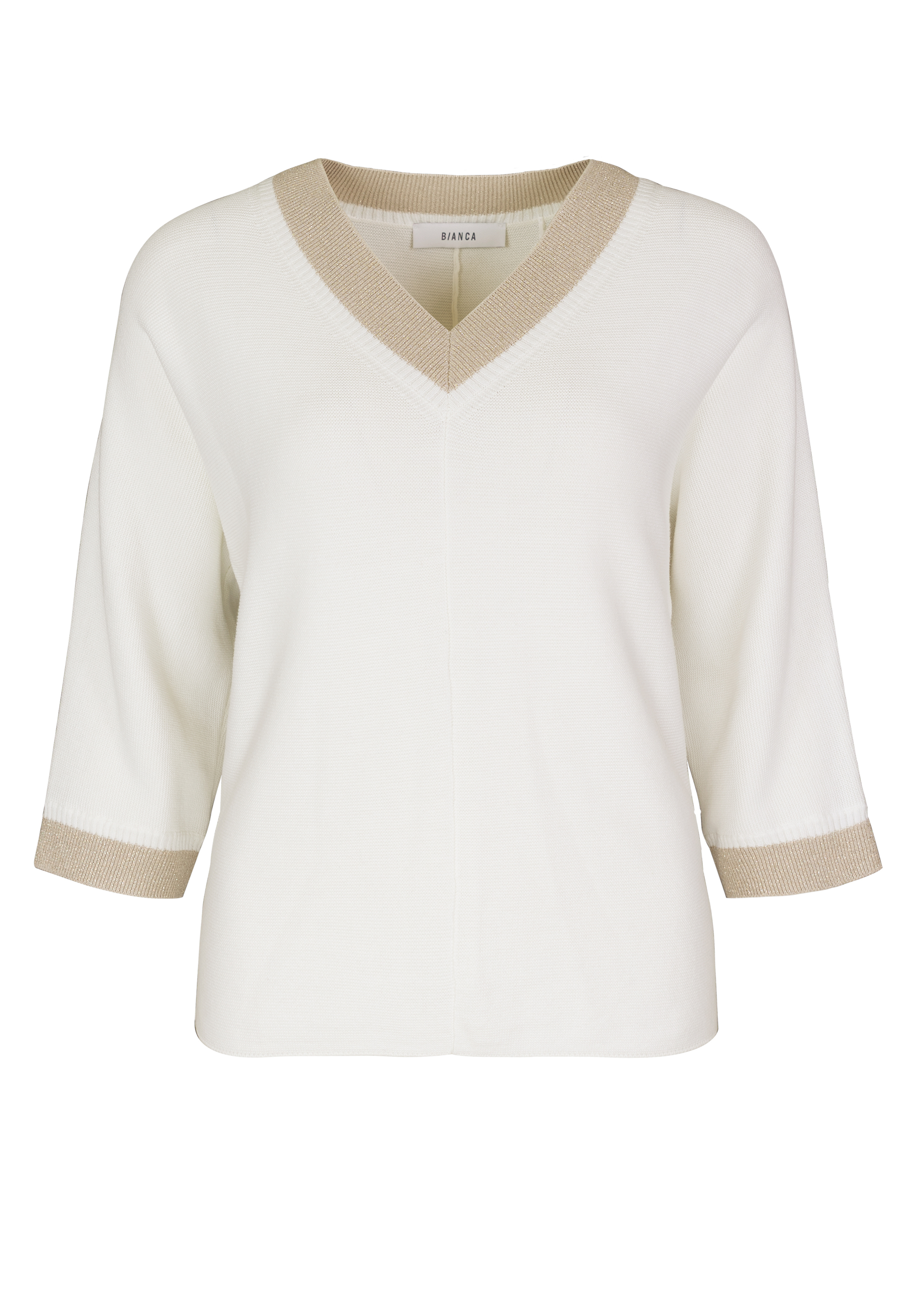 Unser stilvoller Strickpullover Dita überzeugt mit einem cleanen Design und edlen Details. Der V-Ausschnitt wird durch einen kontrastfarbenen, leicht glänzenden Abschluss betont und verleiht dem Modell eine elegante Note. Auch die 3/4-langen Fledermausärmel greifen das feine Kontrastdetail am Saum auf und sorgen für ein harmonisches Gesamtbild. Die lockere, gerade Passform mit Saumschlitzen fällt angenehm weich und macht Dita zu einem vielseitigen Begleiter - perfekt für stilvolle Alltagslooks ebenso wie für gepflegte Anlass-Outfits.