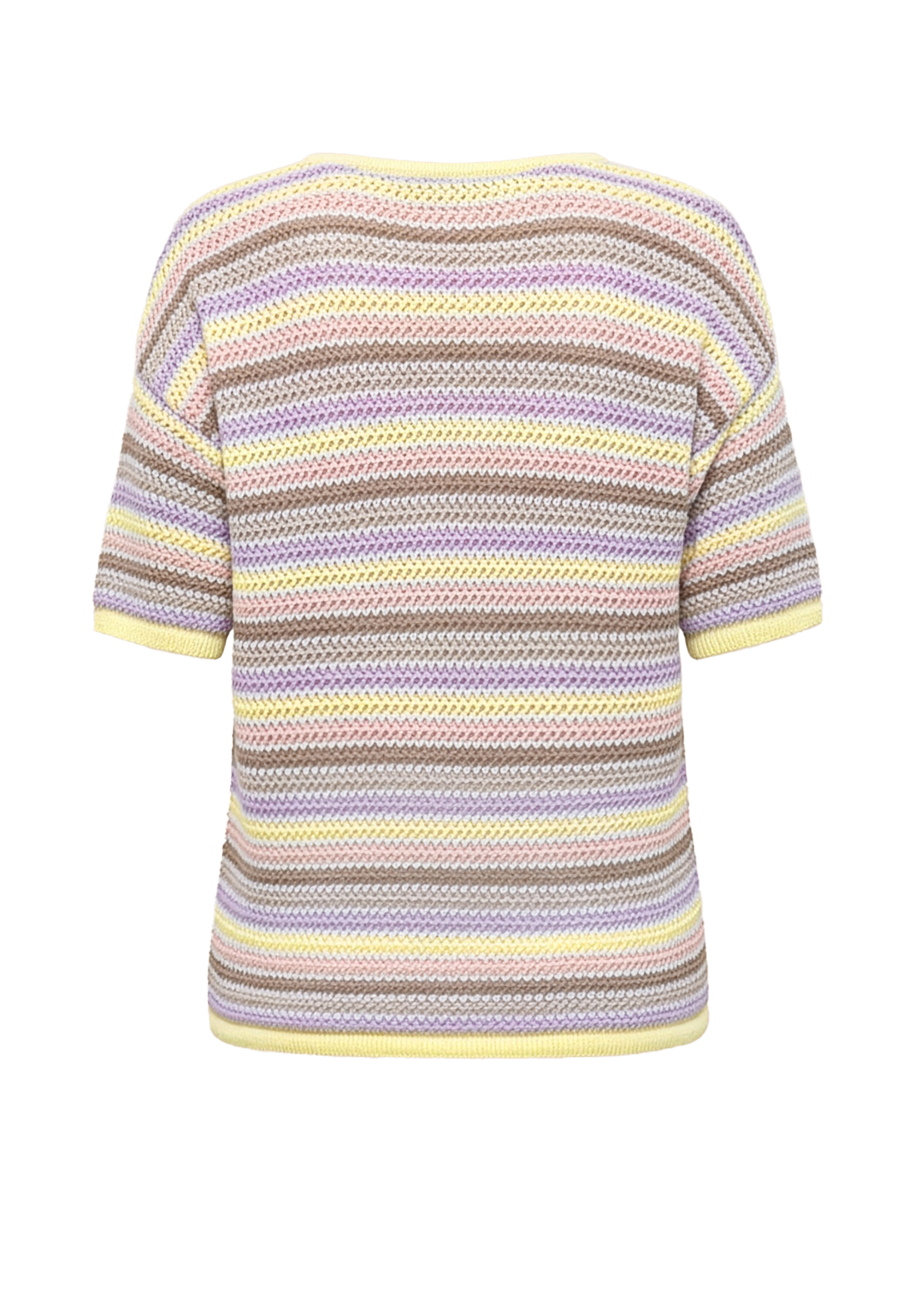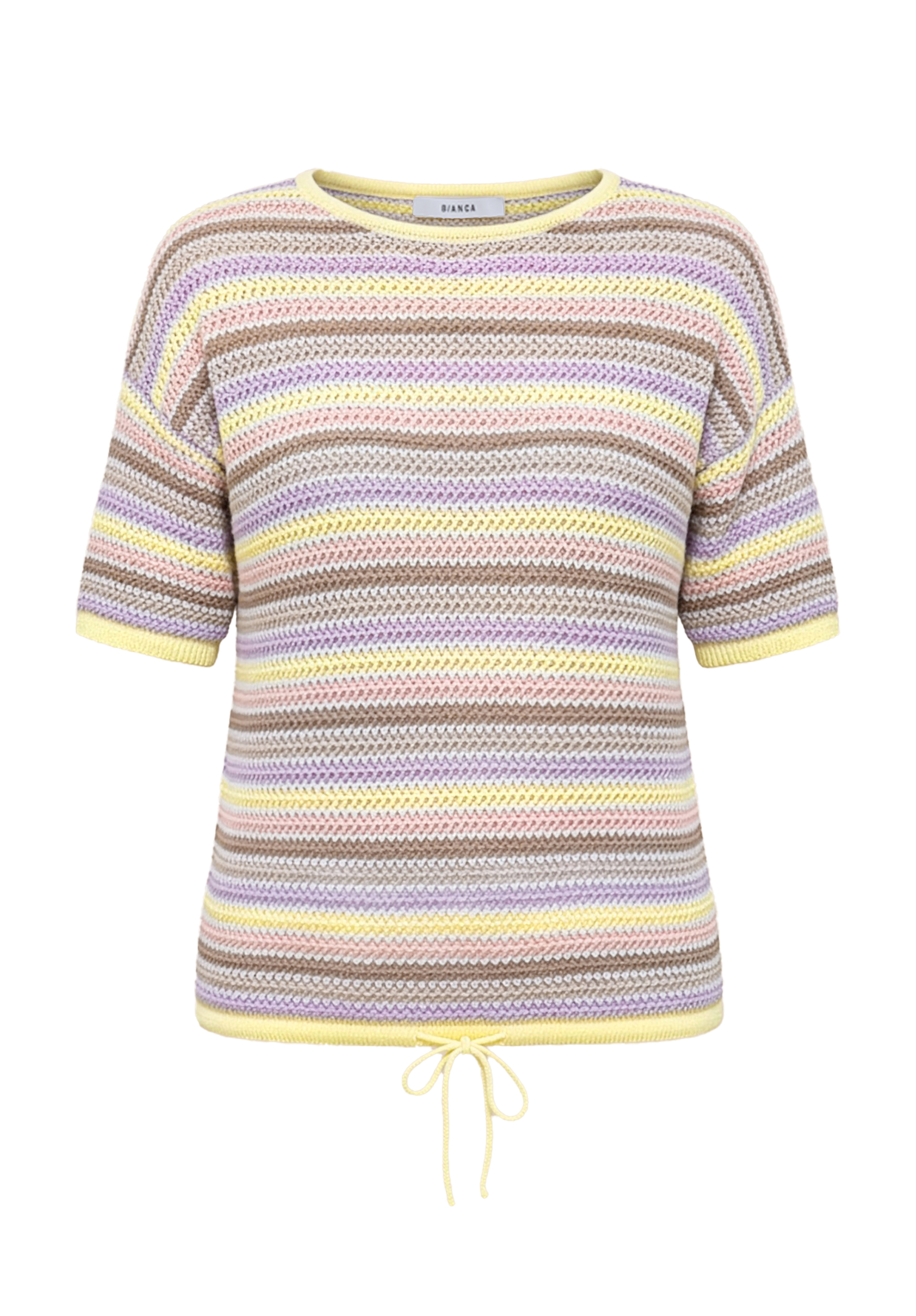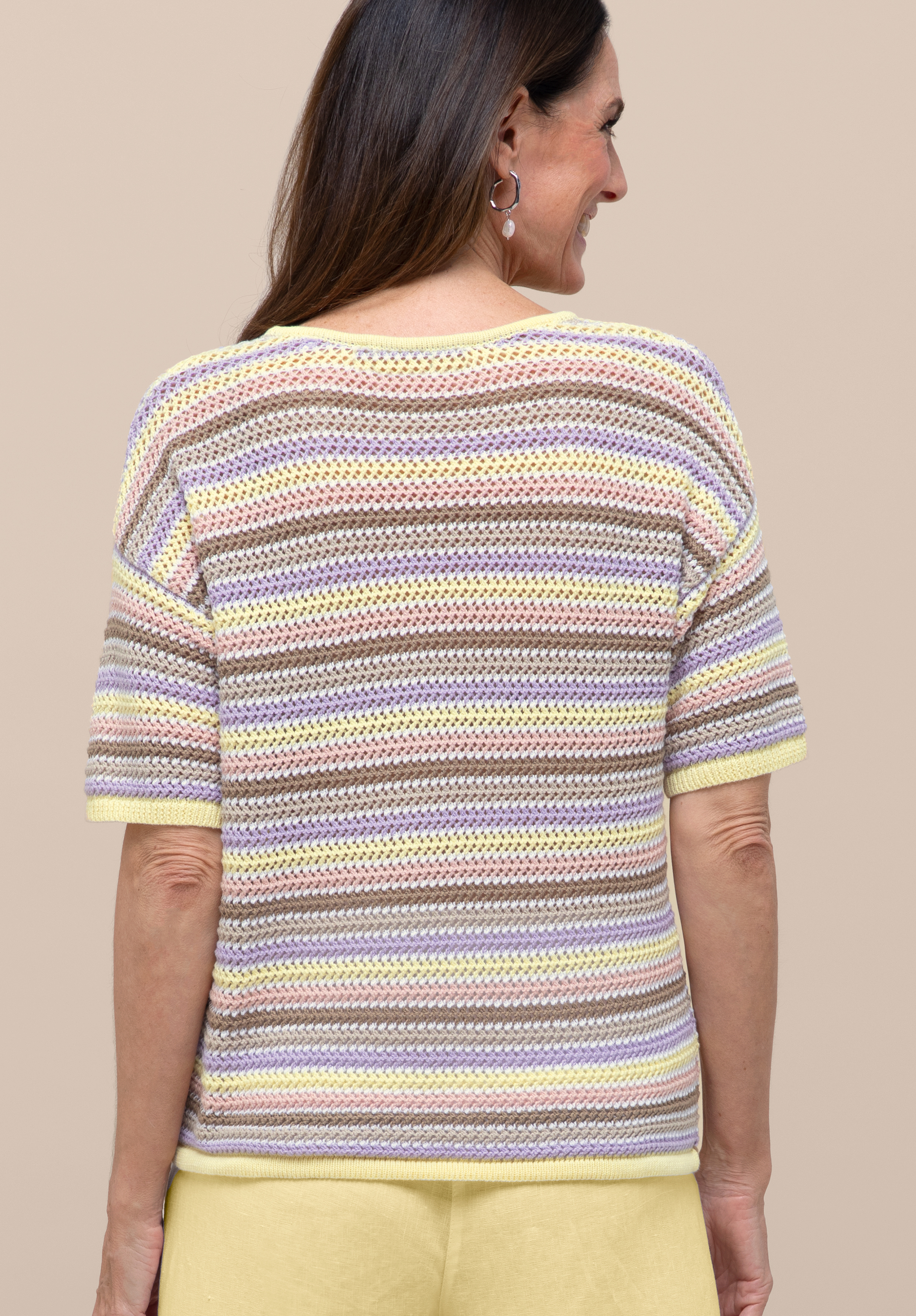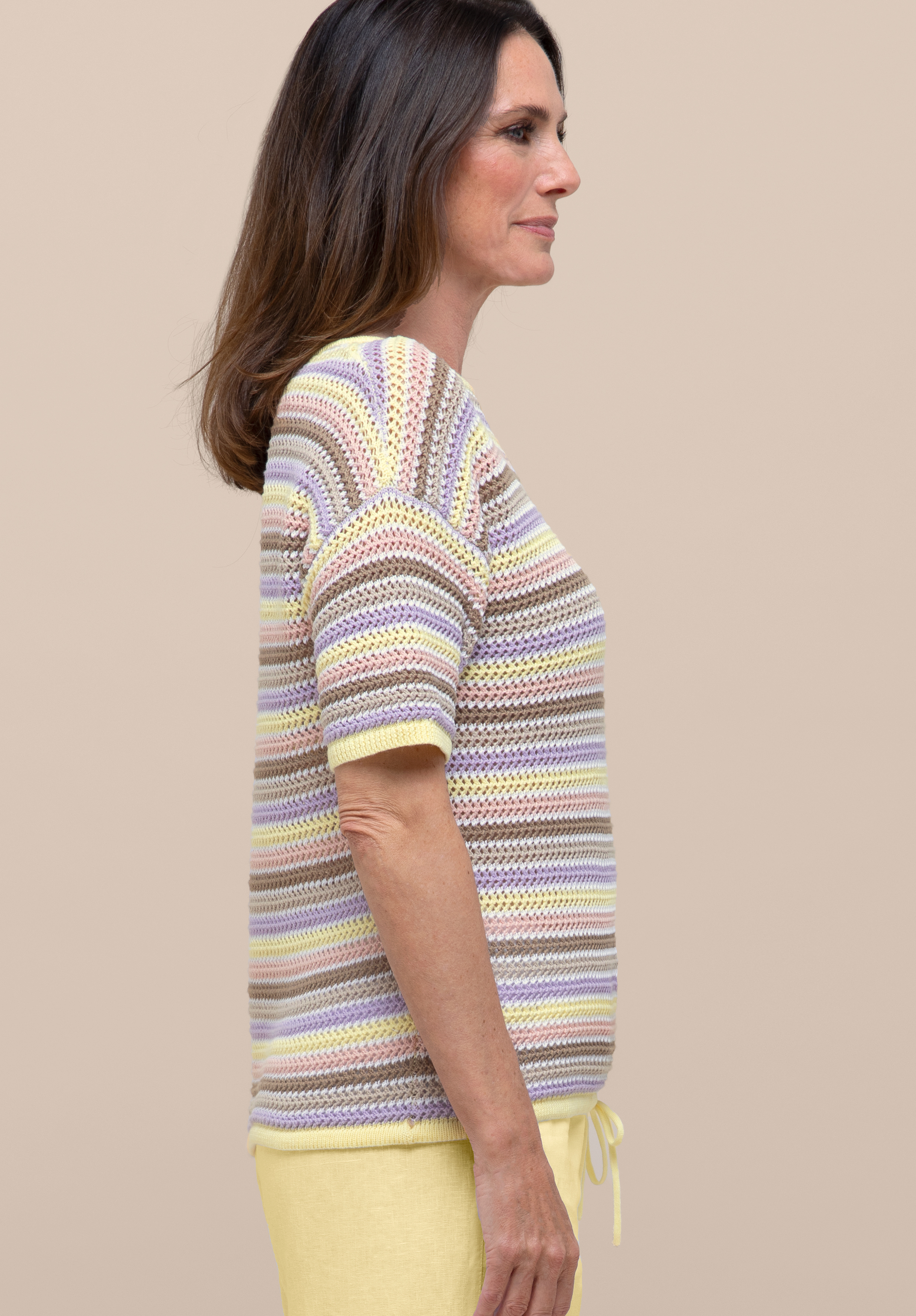 Unser Strickpullover Olinde begeistert mit seiner modernen Strick-Optik und dem stylischen Streifendessin in aktuellen Trendfarben. Gefertigt aus 100 % Baumwolle, bietet er mit seiner lockeren Passform ein angenehm bequemes Tragegefühl. Der Rundhalsausschnitt, das Bindeband am Saum und die überschnittenen kurzen Ärmel verleihen dem Pullover eine legere, feminine Note. Ob zu Jeans für den Alltag oder kombiniert mit einer Businesshose -Olinde ist ein vielseitiger Begleiter für jeden Anlass.